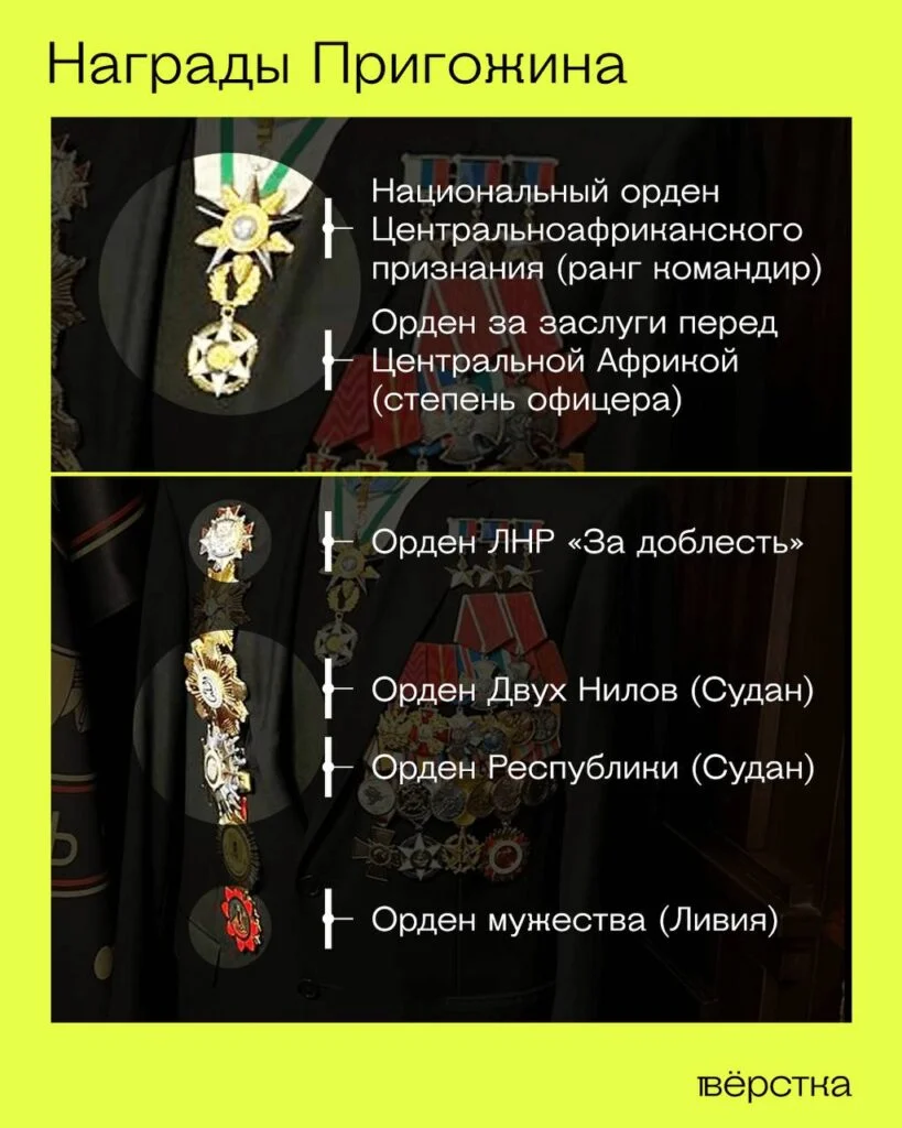 Ещё шесть наград владелец ЧВК получил в Центральноафриканской республике. Это два ордена за заслуги перед ЦАР, а также звезда за заслуги, крест «Воинской доблести», орден примирения ЦАР и национальный орден. Также у Пригожина есть две награды из Судана — орден Республики — высшая государственная награда государства и орден «Двух Нилов», который вручается за заслуги перед государством на военной и гражданской службе. Кроме того, в самом низу правого борта кителя закреплен орден мужества Ливии, учрежденный в 1969 после военного переворота Каддафи. Неизвестно, как его получил Пригожин, поскольку после революции 2011 года многие учрежденные диктатором награды были упразднены.