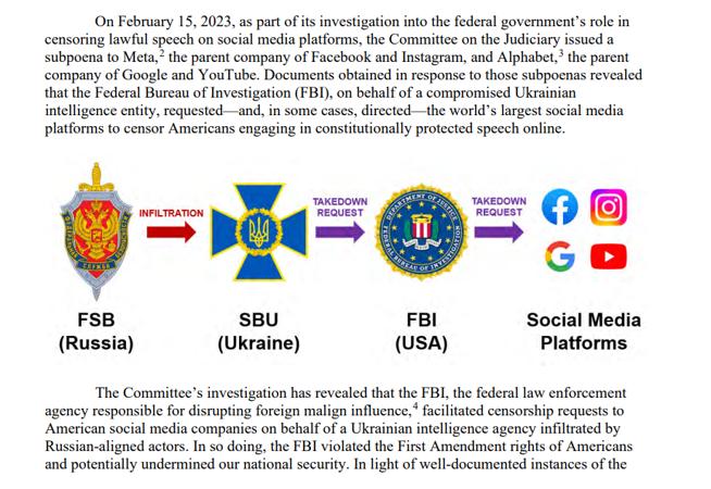 "ФБР и СБУ неоднократно запрашивали удаление или приостановку действия подлинных аккаунтов, выражающих однозначно проукраинские взгляды, а также оппозиционных российским. Иногда ФБР даже связывалось с соответствующей платформой, чтобы убедиться, что “эти учетные записи были удалены”. Независимо от предполагаемой цели одобрения запросов СБУ, у ФБР не было правовых оснований для содействия цензуре защищенной речи американцев в социальных сетях", — говорится в отчёте.