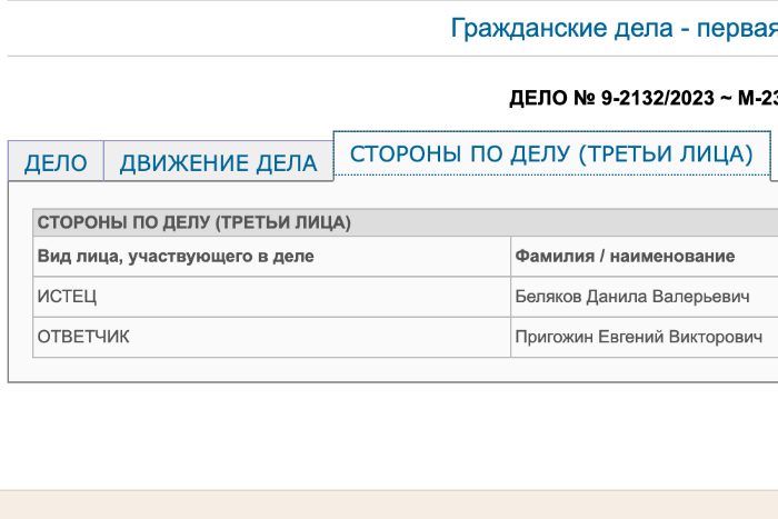Детали. Беляков обвинил Пригожина том, что основатель ЧВК вызвал у него панику и стресс из-за событий, которые произошли 23 и 24 июня. Иск датирован от 4 июля.