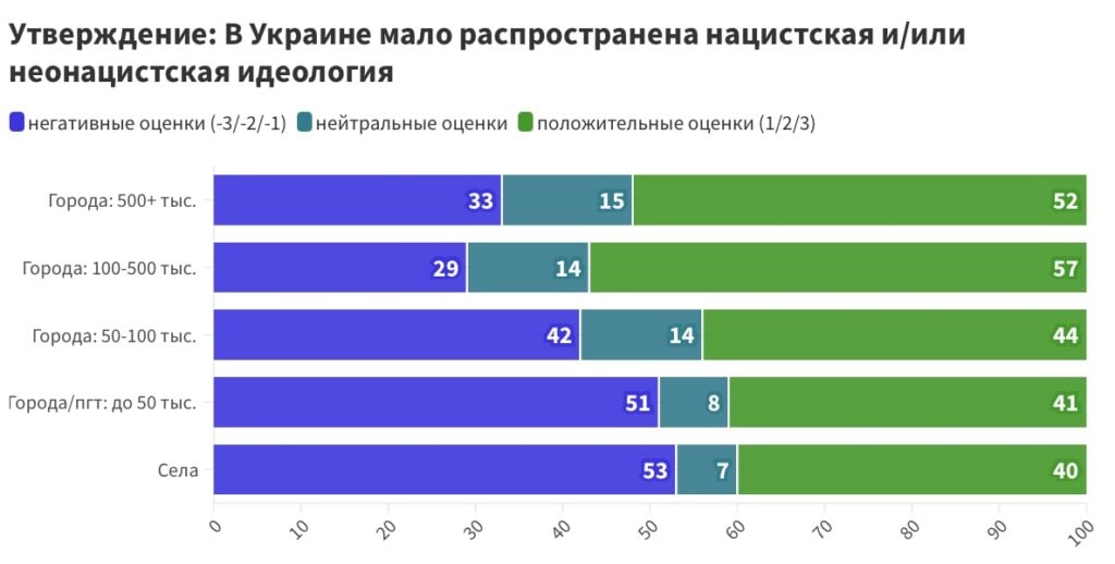 Общая структура ответов жителей больших и малых городов похожа. Независимо от региона проукраинские месседжи о признании вины россиян за массовые убийства в Буче и содействии поставке оружия победе Украины получили почти единодушную поддержку населения. Высокий уровень согласия отмечен и по поводу фальсификации референдумов и запрета пророссийских партий. Впрочем, жители малых городов и деревень реже признавали действенность западных санкций и "малораспространенность нацистской идеологии в Украине. В то же время они больше других поддерживали пророссийские нарративы по Западу, НАТО и ответственности украинской власти за гуманитарный кризис.