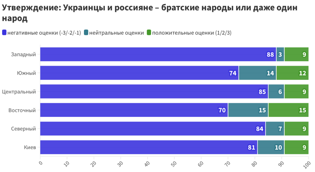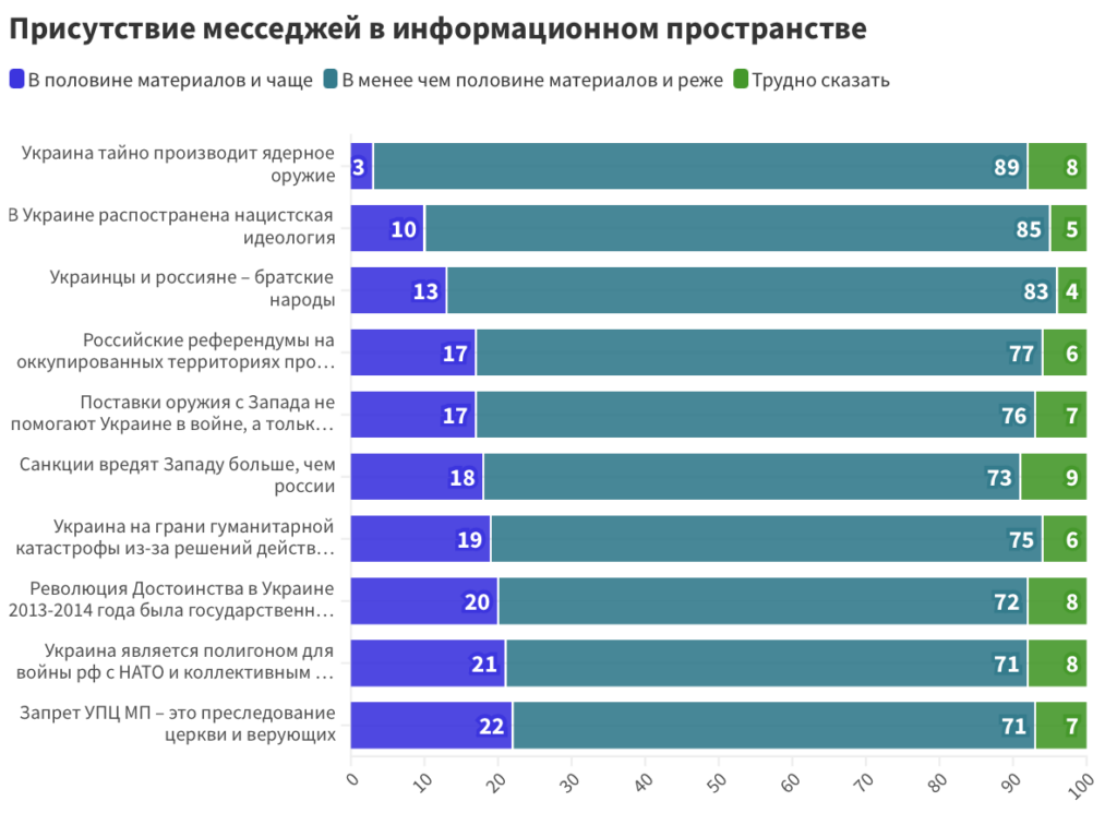 В целом большинство опрошенных как в Украине, так и за рубежом соглашаются с проукраинскими месседжами и не соглашаются с пророссийскими. Это говорит об общей тенденции к способности населения отличать нарративы российской пропаганды. Впрочем, при анализе каждого нарратива отдельно заметны следующие тревожные сигналы: