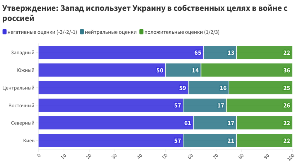 - 25% опрошенных в Украине и 29% за границей согласились с утверждением «Запад использует Украину в собственных целях в войне с Россией»;