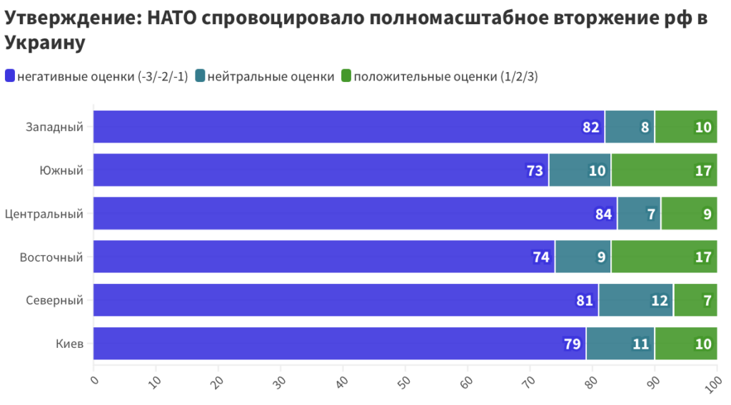 Также жители Юга и Востока чаще подтверждали влияние провокации НАТО на российское вторжение. И наоборот, проукраинские месседжи получают меньшую поддержку жителей южных и восточных областей. Речь идет о тезисах о незаконности российских референдумов, преимуществах от поставок оружия, признании массовых убийств в Буче военными преступлениями российской армии и борьбы с коллаборантами в политике и СМИ.