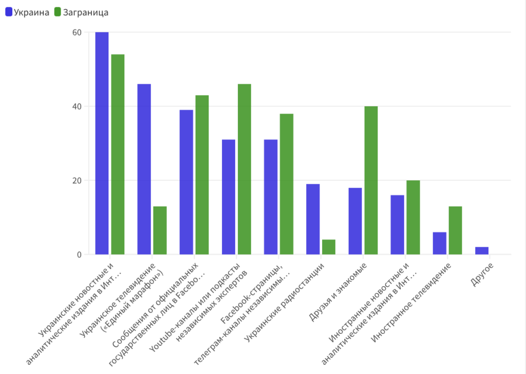 Респонденты, отслеживающие иностранные СМИ (телевидение, аналитические издания) и избегающие украинские, склонны соглашаться с пророссийскими утверждениями. В основном главными источниками информации украинцы отмечают украинские новостные и аналитические издания и украинское телевидение. Украинцы за границей больше склонны прислушиваться к «независимым экспертам», друзьям, знакомым и иностранным СМИ.