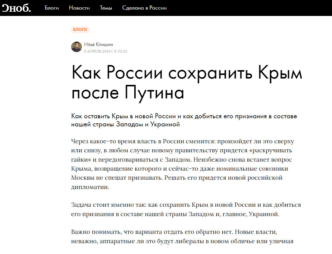Во-первых, две заметки. А во-вторых, не просто заметки. Первая называлась «Как России сохранить Крым после Путина», вторая — «Почему Украина не может вернуться в Европу». Я их прочитал, это вполне себе колонки на заданную тему, где ты рассуждаешь и аргументируешь именно ту позицию, которая вынесена в заголовок.