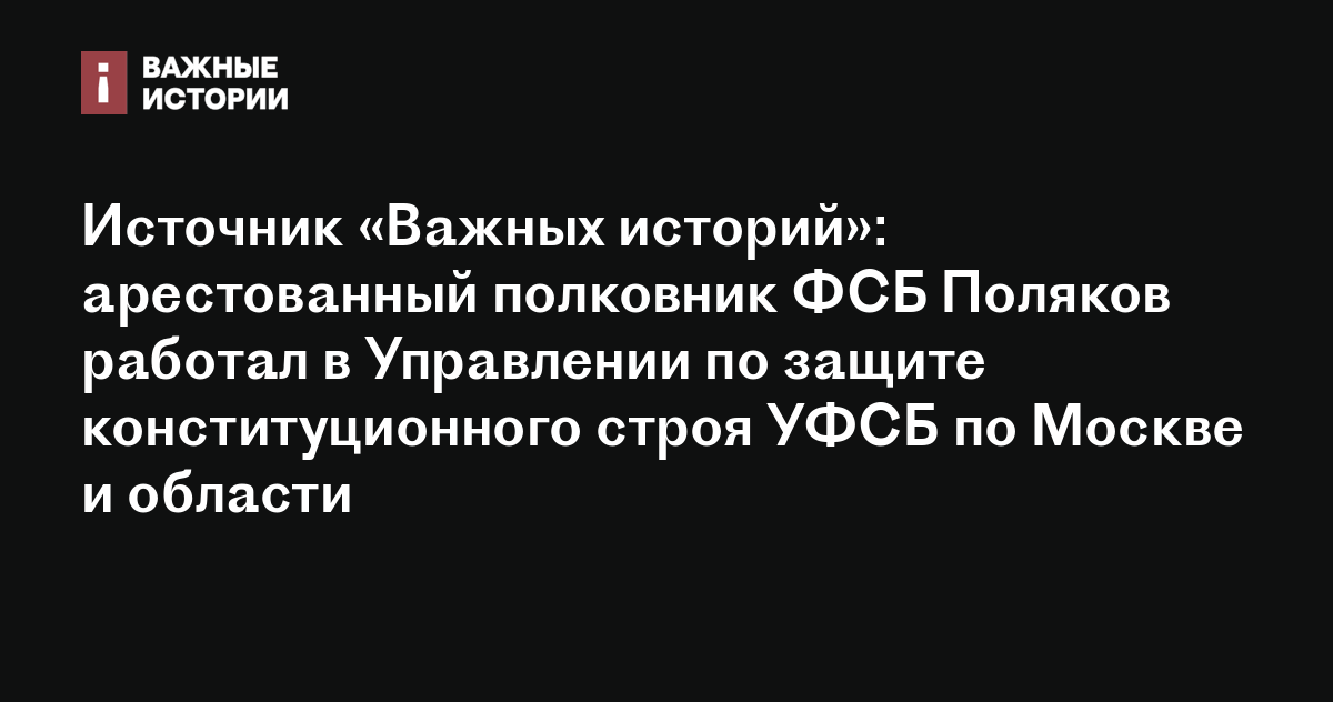 Задержанный 14 июля в Москве полковник ФСБ Михаил Поляков, которого СМИ называют администратором телеграм-канала «Кремлевская прачка», до 2022 года возглавлял одну из служб в Управлении по защите конституционного строя УФСБ по Москве и Московской области, рассказал близкий к спецслужбам источник «Важных историй».