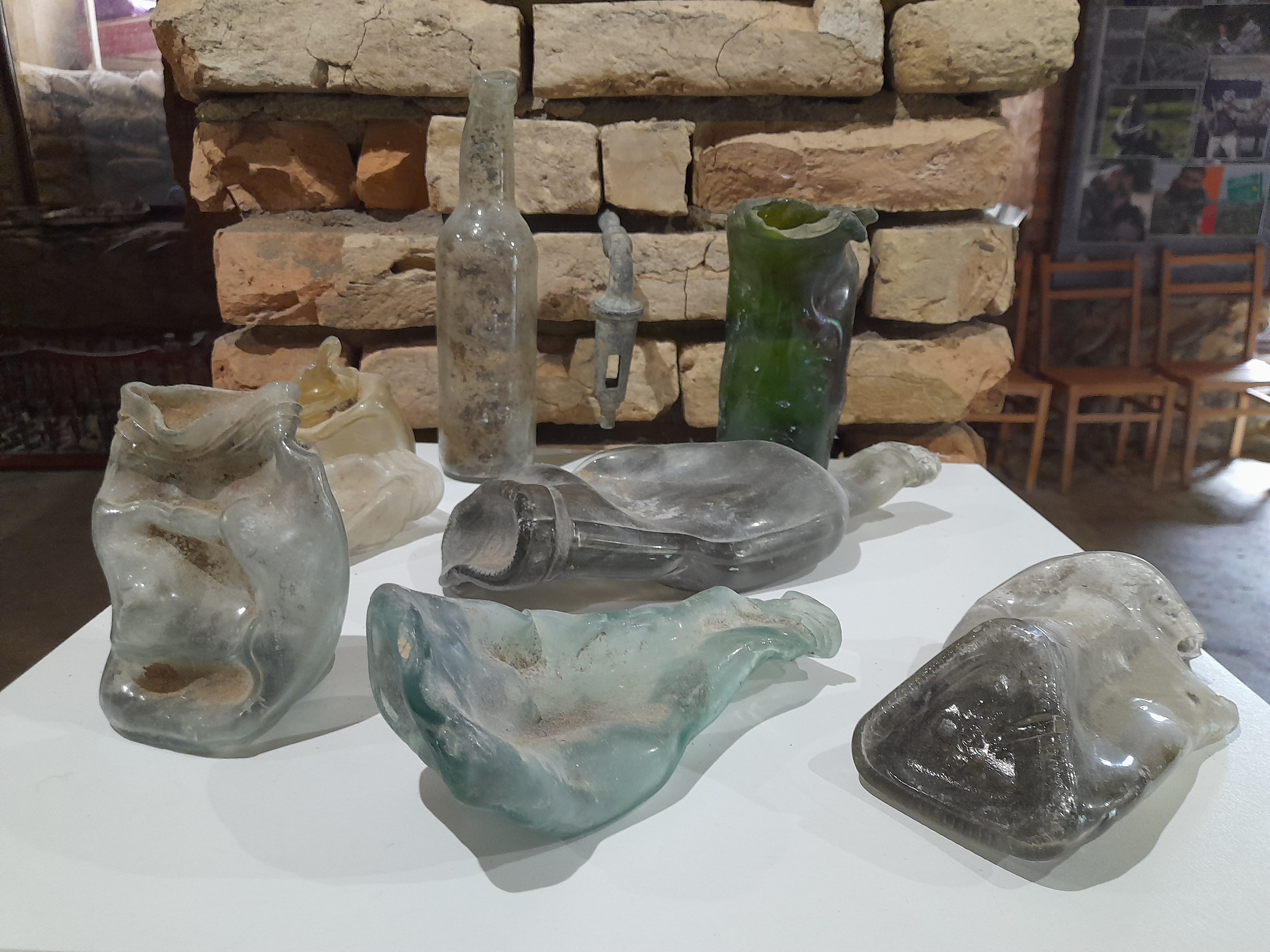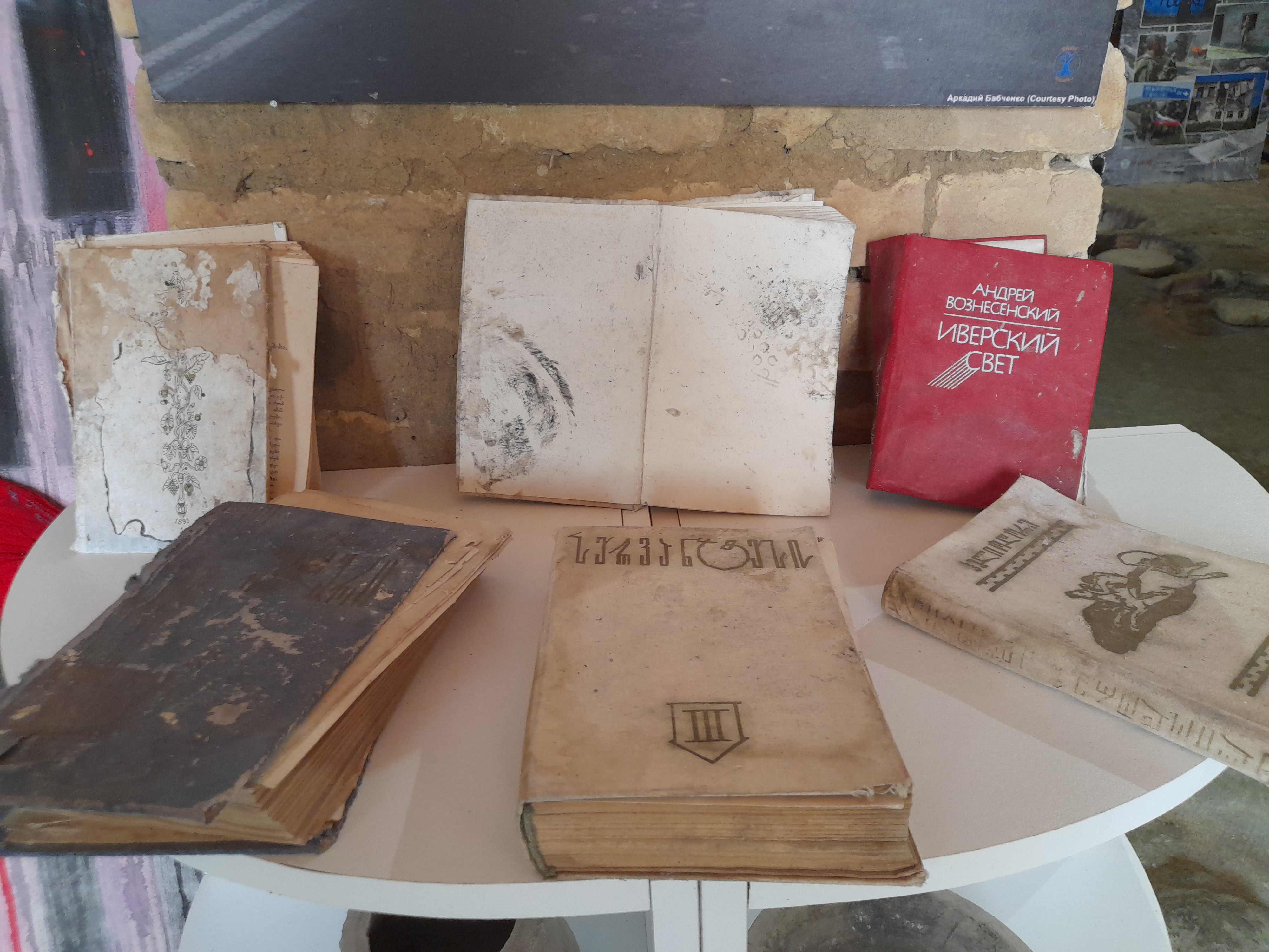 На столике выставлены стеклянные бутылки и банки причудливой формы: стекло расплавилось во время пожара. Жители одного из домов в Эргнети принесли несколько книг, уцелевших в огне. Среди них – том сочинений Фридриха Шиллера. На форзаце книги отпечатался след военного ботинка.
