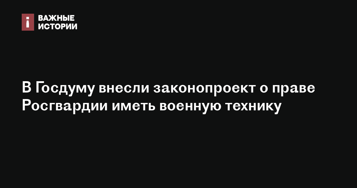 В Госдуму внесен законопроект, который дает право Росгвардии иметь на вооружении военную технику. Его авторами стали председатель комитета Госдумы по информационной политике Александр Хинштейн, председатель комитета Госдумы по обороне Андрей Картаполов и глава комитета по безопасности Василий Пискарев.