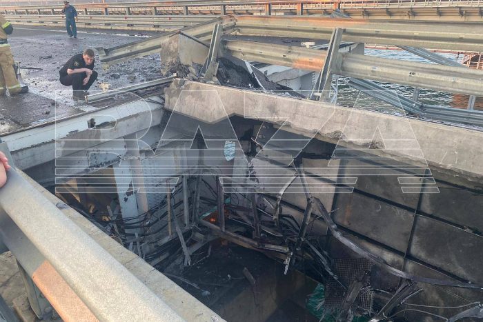 Контекст. Крымский мост повредили второй раз с начала войны. Вероятно, его атаковали надводными дронами. В Минтрансе РФ заявили, что со стороны Крыма повреждено дорожное полотно, но «конструкции пролетов находятся на своих опорах», информацию о повреждении опор там отрицают.