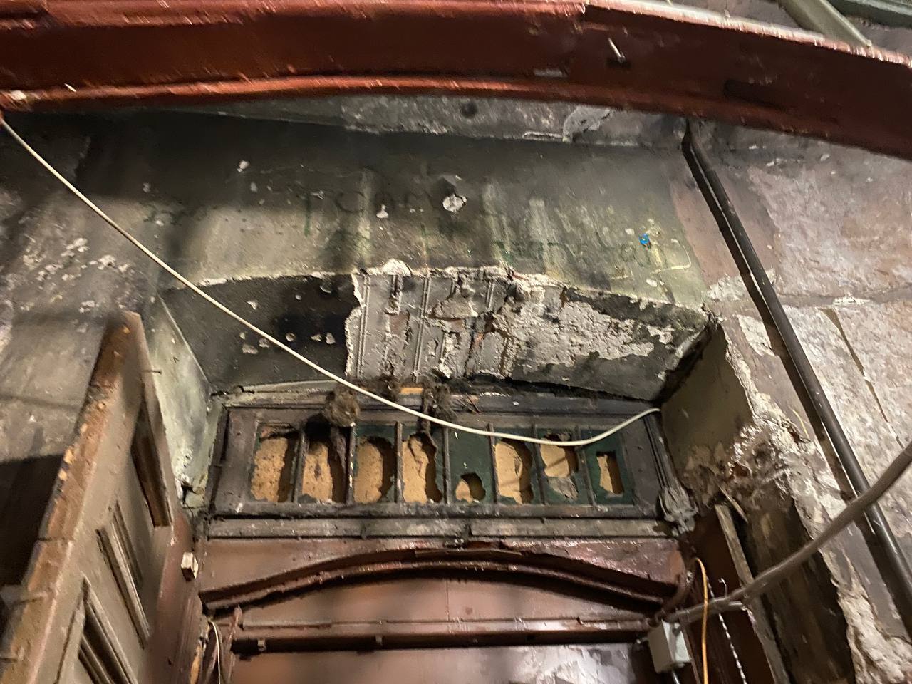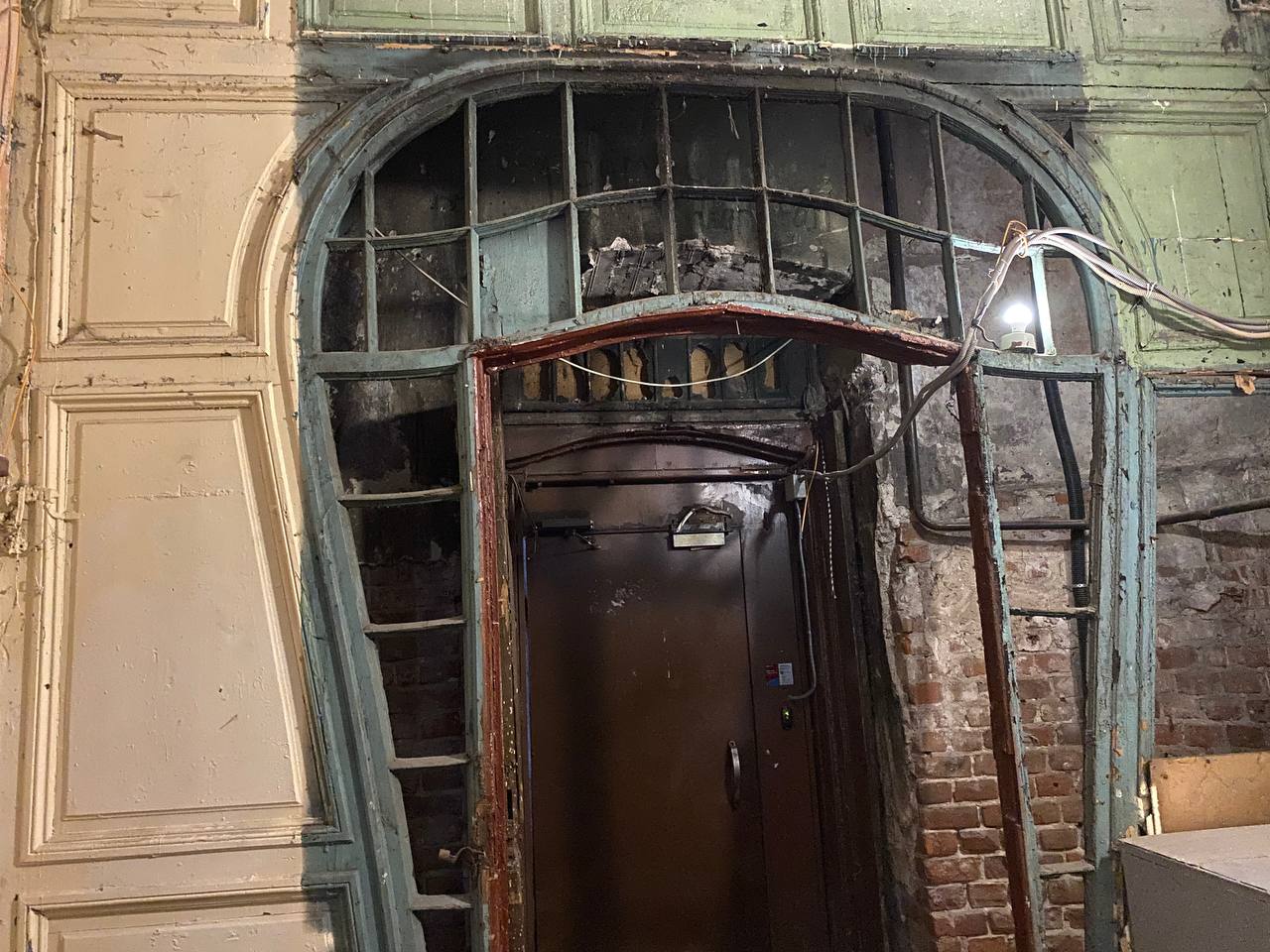 Работы по демонтажу входной парадной группы начались 14 июля. Тогда удалось обнаружить историческую находку — обгоревший после пожара тамбур и старинную дверь, частично пострадавшую от огня.