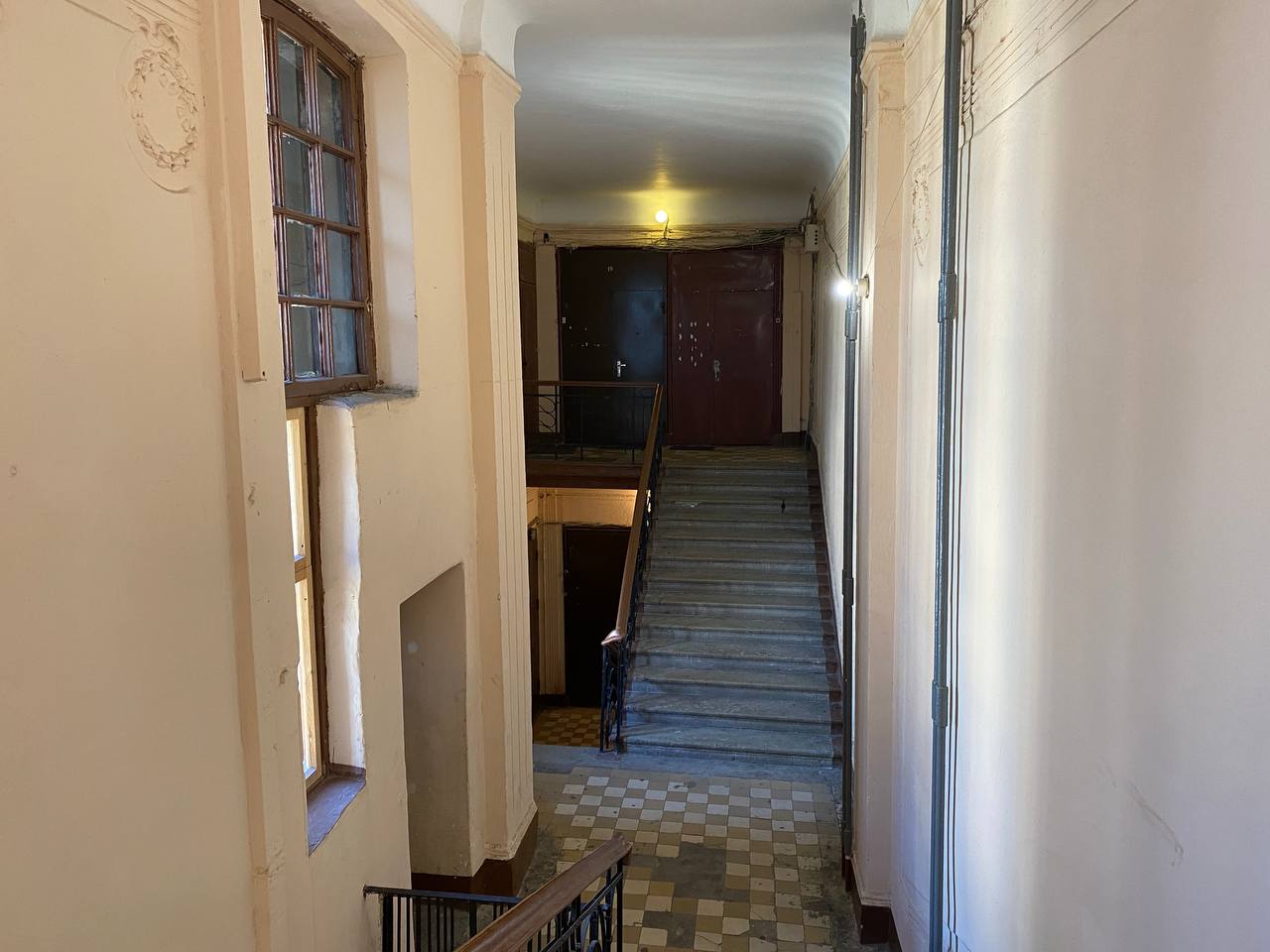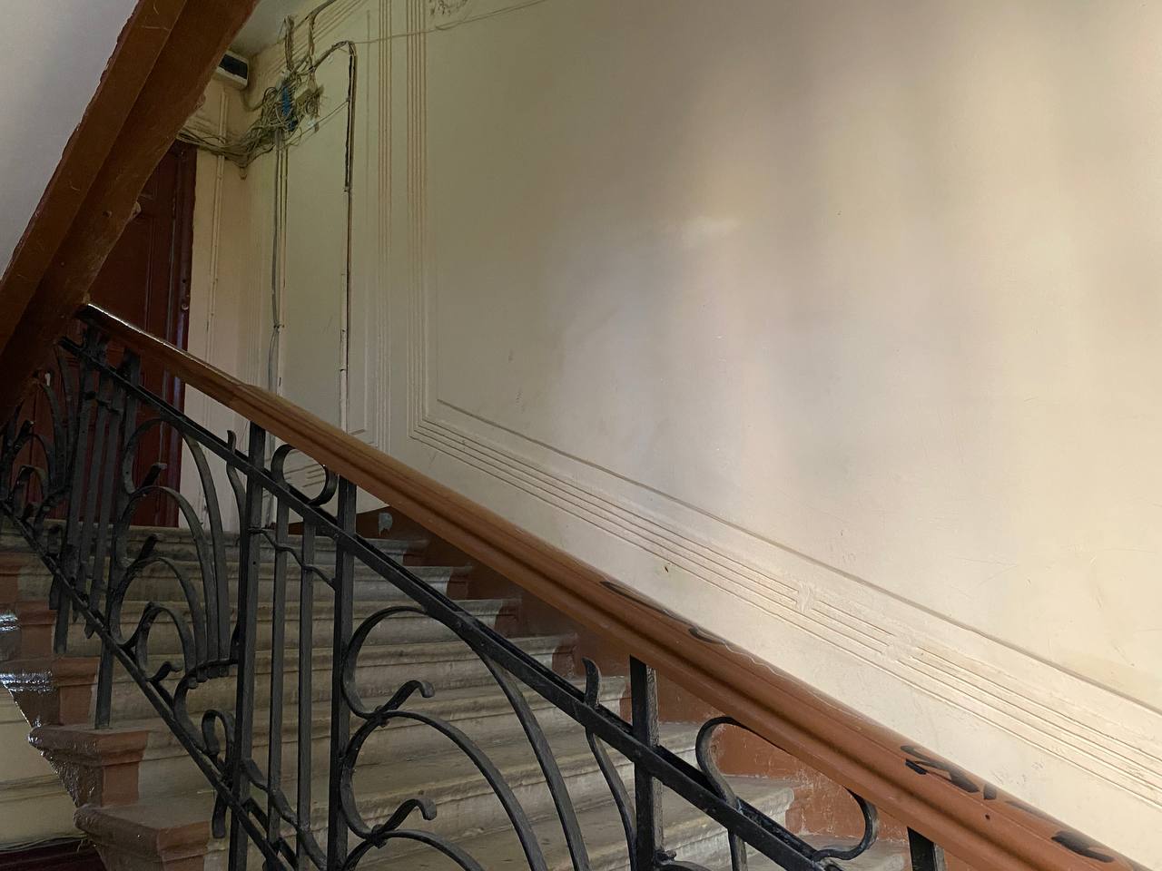 Во времена СССР квартиры в доме переделали под коммунальные. Сейчас в парадной признанного памятника архитектуры — облезлая штукатурка на стенах, висящие под потолком комки проводов и разбитый кафель на полу.