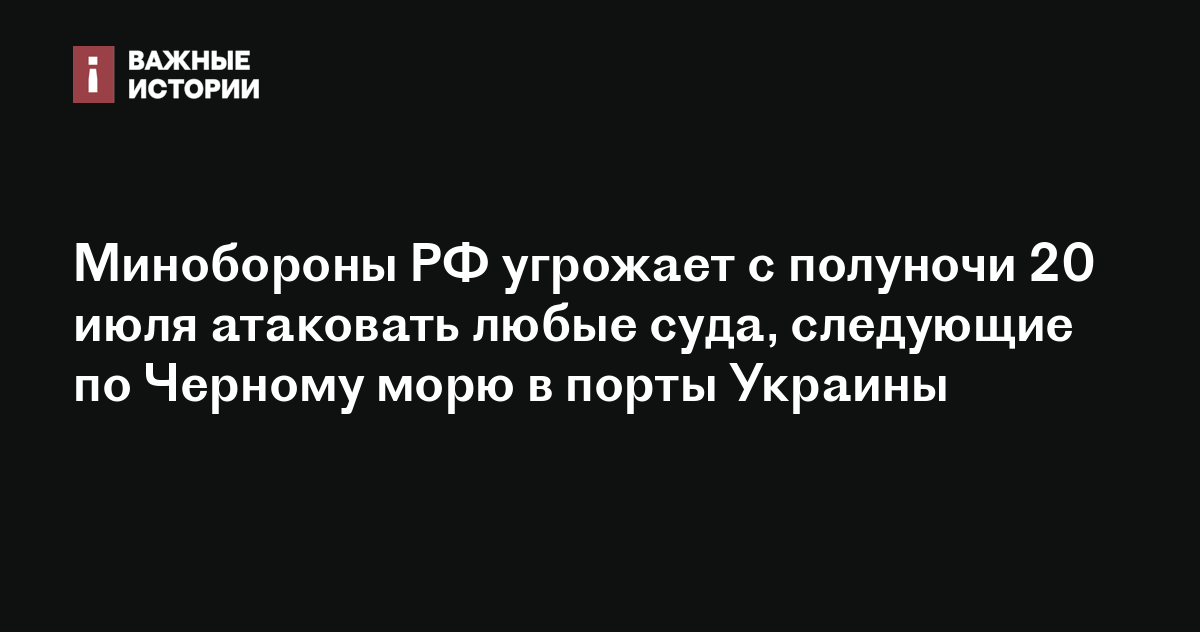 «С 00:00 мск 20 июля суда, следующие по Черному морю в порты Украины, будут рассматривать как перевозчики грузов военного назначения. Страны флагов судов, следующих в украинские порты Черного моря, будут считаться вовлеченными в конфликт на стороне Киева», — заявили в Минобороны РФ (цитата по ТАСС).