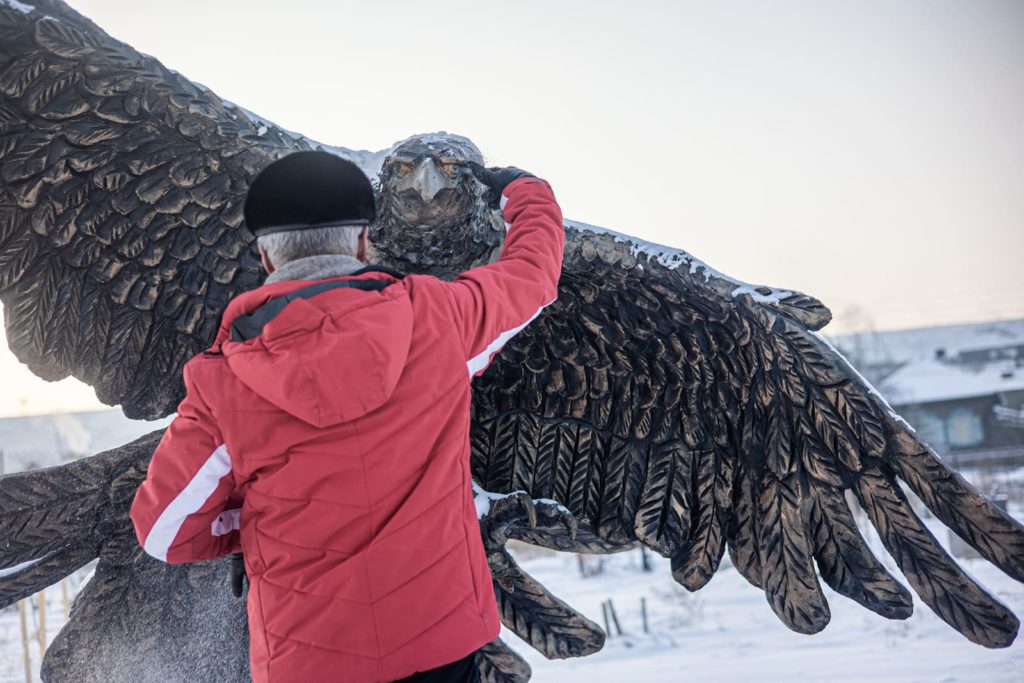 "Мама и папа у меня – буряты, я шаманист, а орёл – моё тотемное животное, – объясняет мэр. – Ну, вы много орлов в городе увидите. Скульптуры там, картины. Орёл – это такая птица-творец".