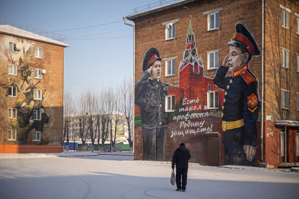 Январь 2023 года. Мэр Свирска Владимир Орноев стоит возле фонтана на улице Лермонтова в Свирске и разговаривает с двумя мальчиками лет восьми–девяти. На Орноеве – ярко-красная куртка и меховые унты. В городе морозы, и мальчики ёжатся от холода. "Ну, как вам рисунки? Что чувствуете?" – спрашивает 61-летний Орноев, показывая на торец ближайшего дома. На нём нарисованы два подростка-кадета, между ними – Кремль.