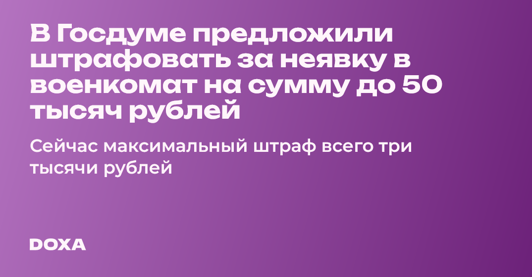 - Предложенные поправки в КоАП предполагают, что за неявку в военкомат без уважительной причины будут штрафовать на сумму до 50 тысяч рублей. Сейчас максимальная сумма штрафа — три тысячи рублей.