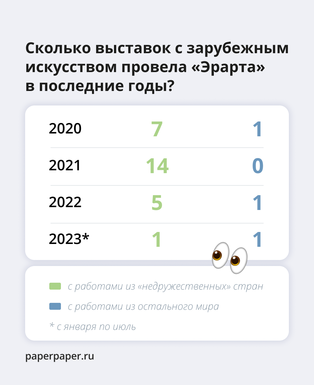 Число экспозиций с искусством из нейтральных стран остается относительно стабильным. В первые семь месяцев 2023 года Эрмитаж показал посетителям археологический артефакт из местности Хирбет Кейафа под Иерусалимом, а также фотографии молодых авторов из Сербии, Армении, Казахстана и других стран. А в «Эрарте» в июне открыли выставку чилийского фотографа Фелипе Лавина.