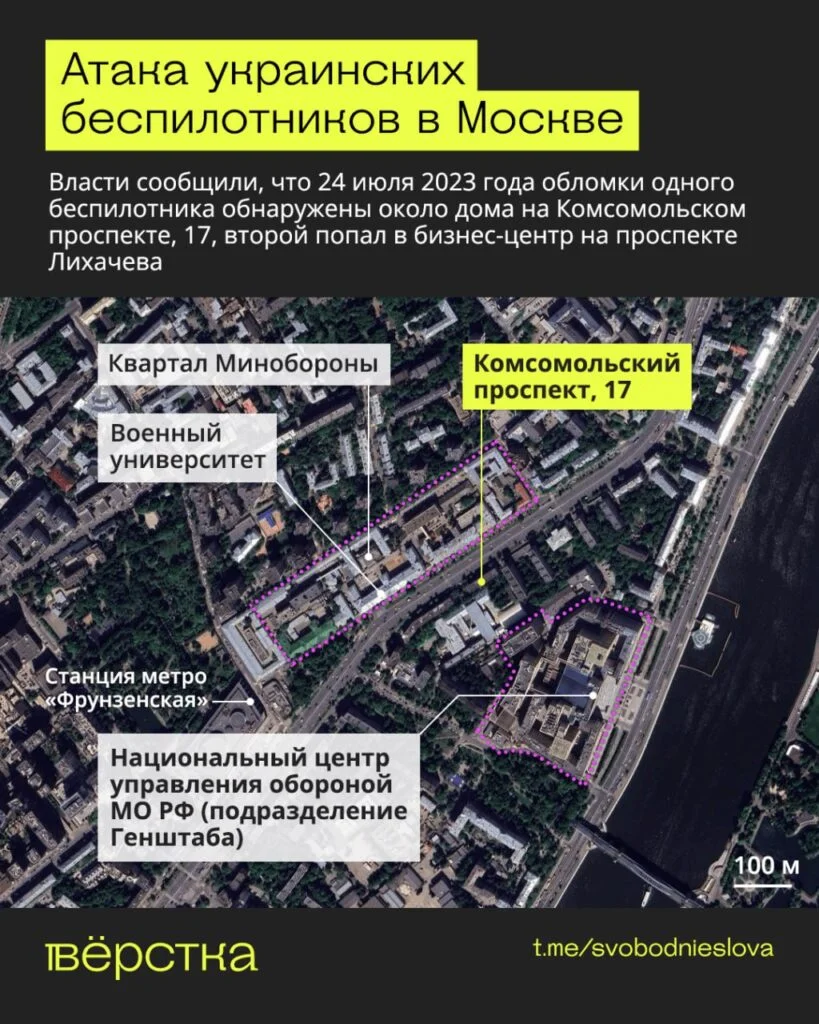Один БПЛА взорвался после попадания в районе здания Военного университета на Комсомольском проспекте. По кадрам видно, что повреждена крыша здания Университета. Это здание — часть квартала Минобороны, здесь размещаются также военный оркестр, покликлиника Минобороны и другие объекты. Взрывной волной выбиты витрины магазина напротив. Атака произошла всего в 200 метрах по прямой от здания Генштаба на Фрунзенской набережной. Это самый центр московского района Хамовники — самого дорогого в Москве, где живут представители российской элиты.