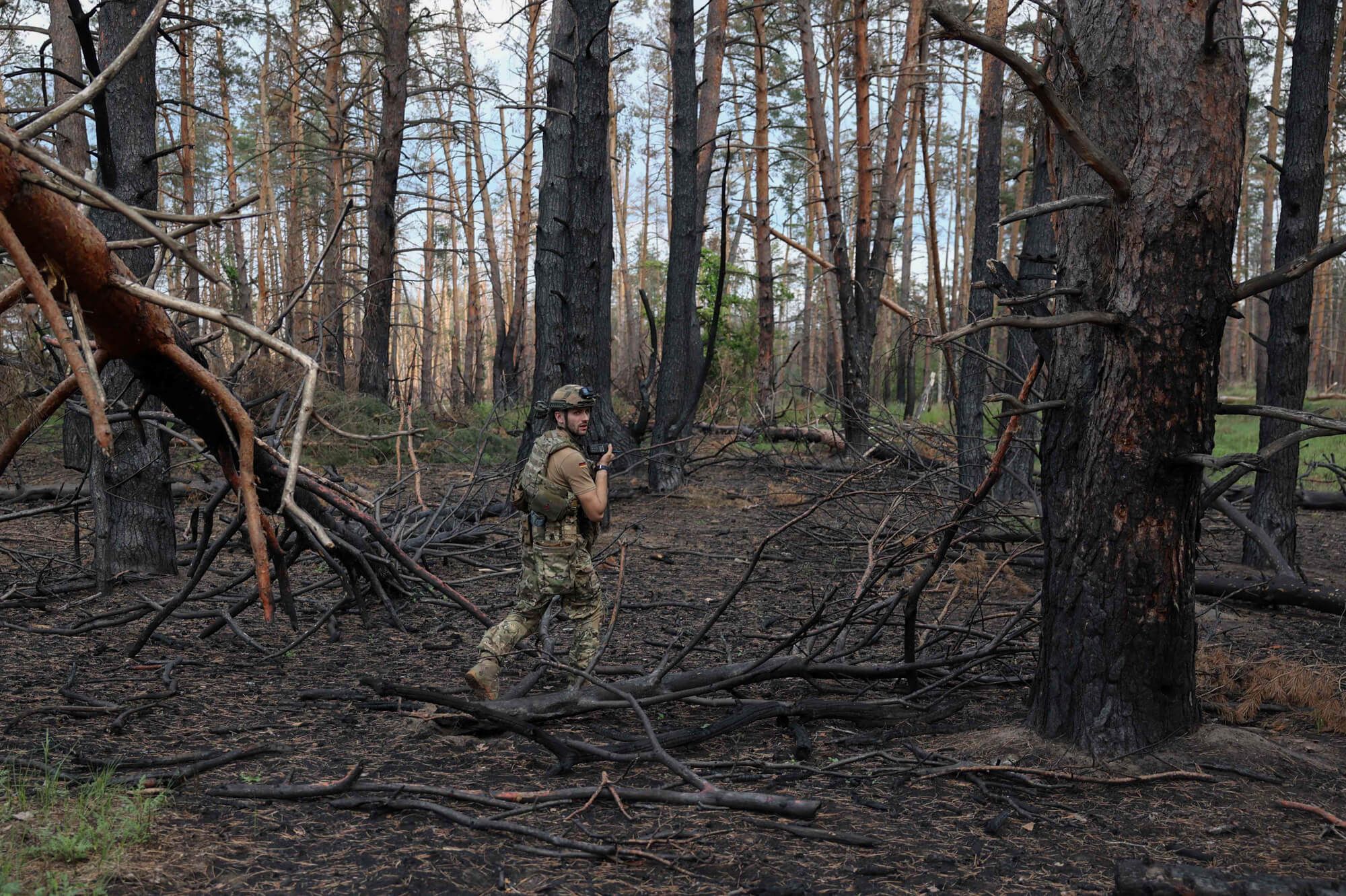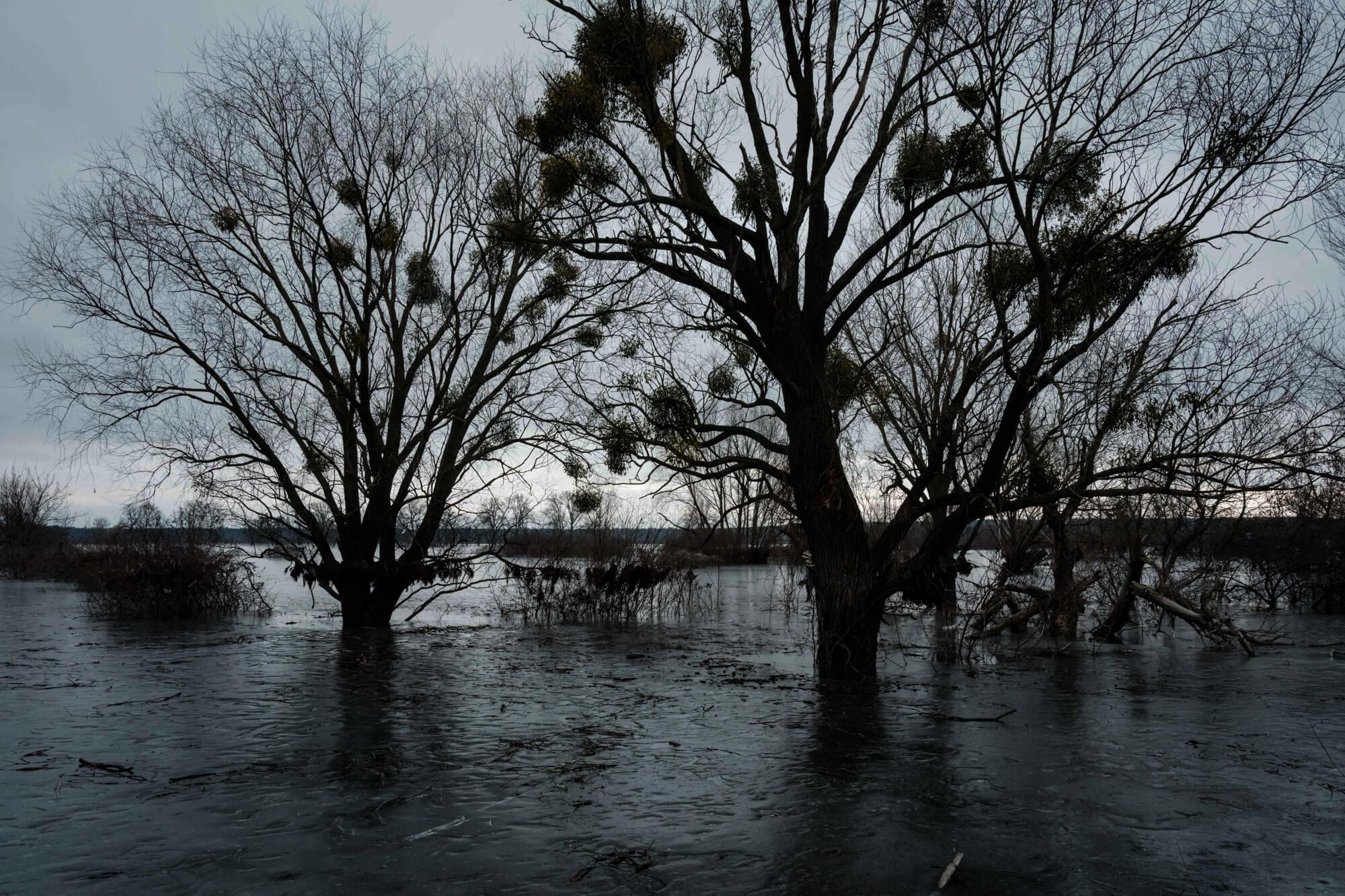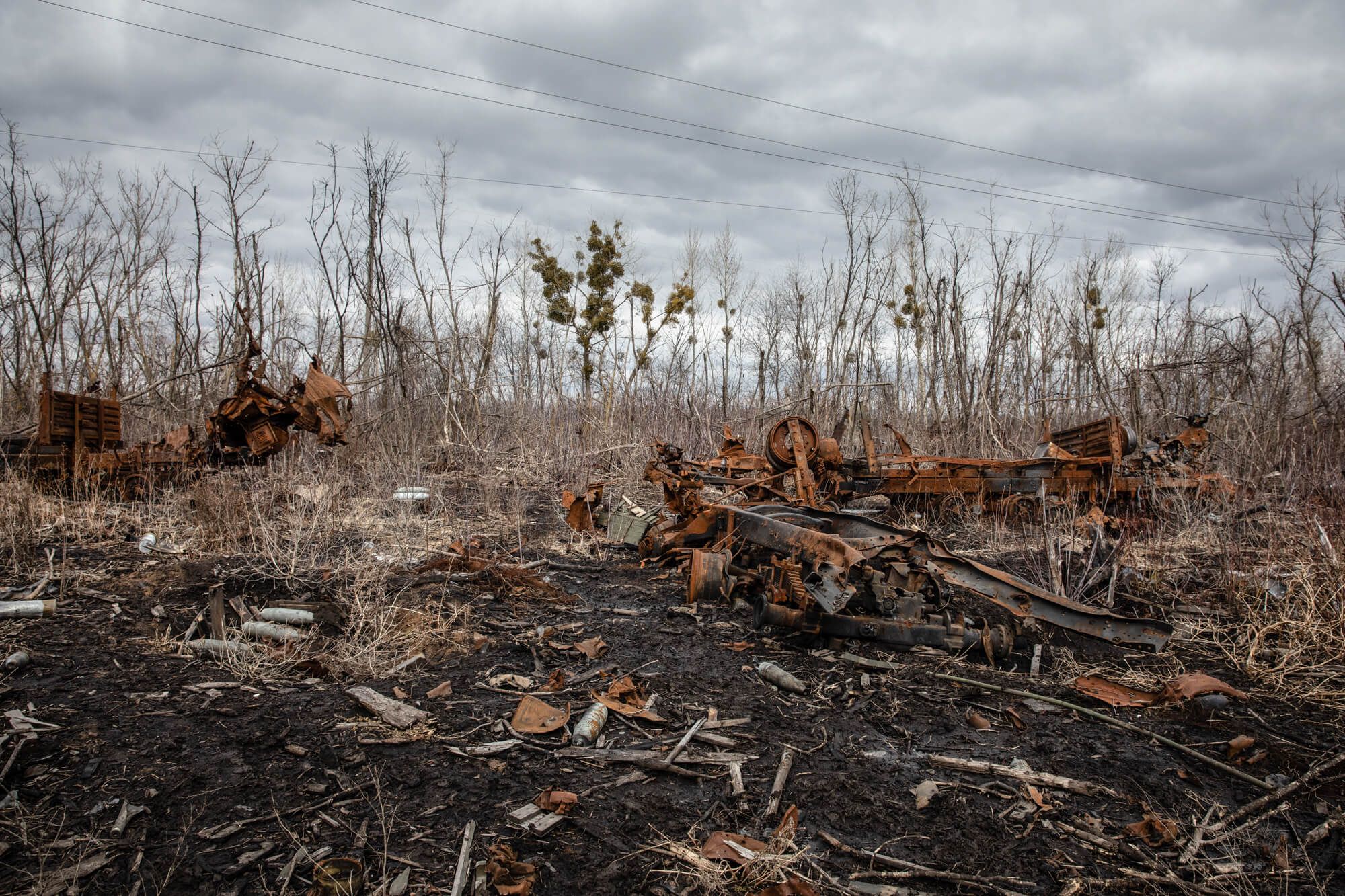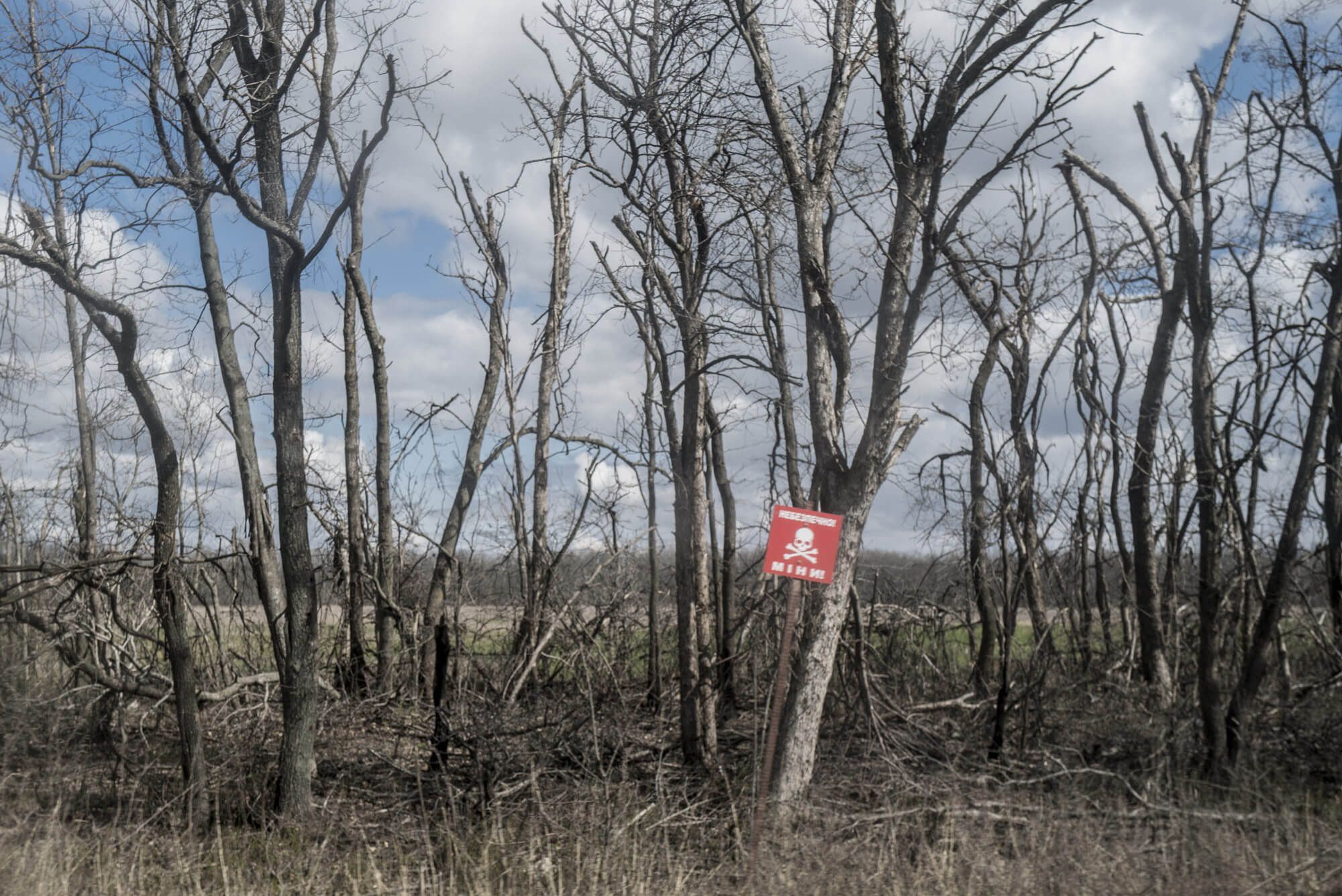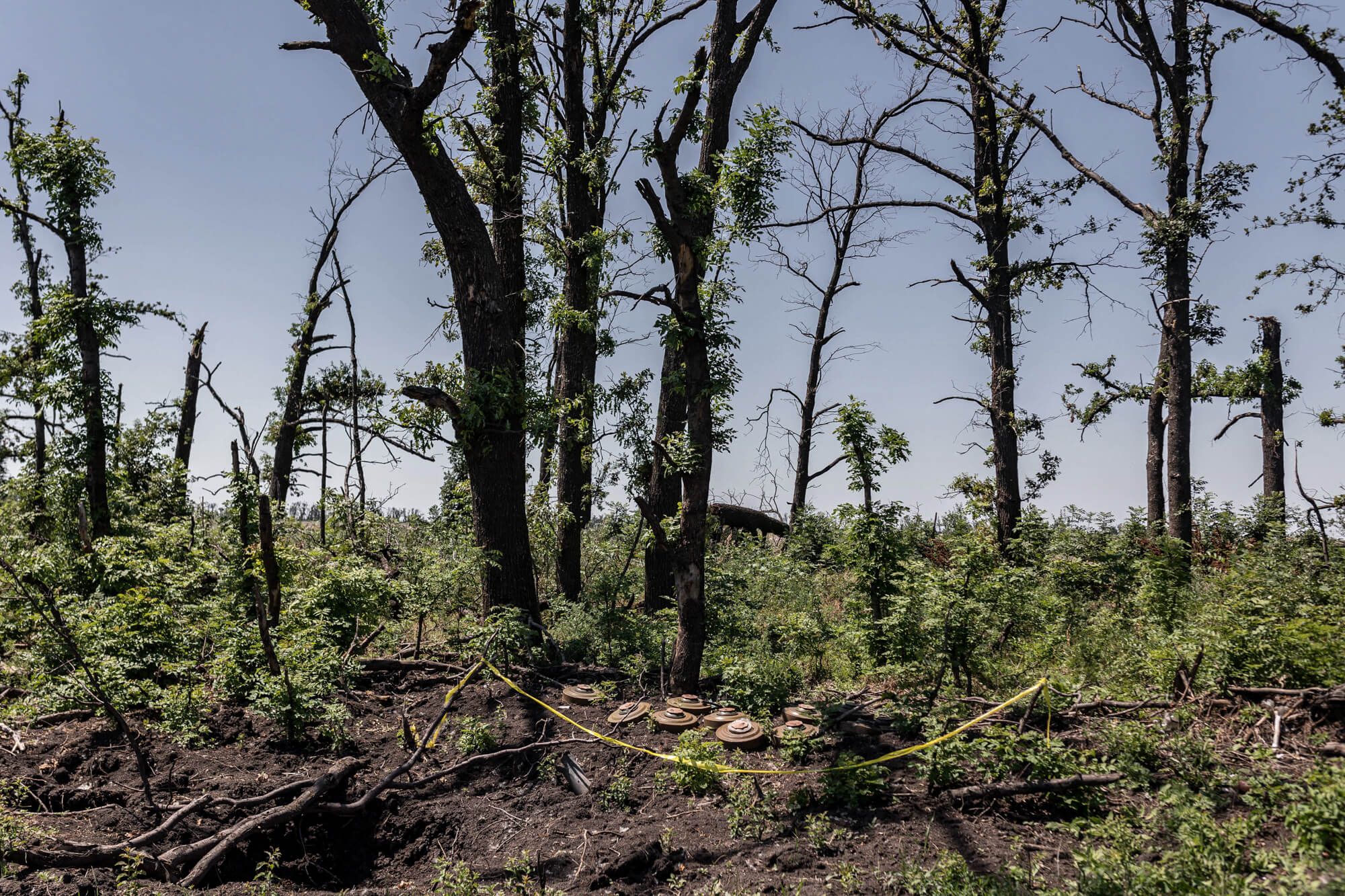 Marko Djurica / Reuters / Scanpix / LETA A forest road in the Chernihiv region after heavy combat followed by Russian troops’ withdrawal, April 2022.Ihor Tkachov / AFP / Scanpix / LETA Holy Mountains National Nature Park in the northern part of the Donetsk region. For several months in 2022, one of the war’s front lines ran through the forest along the Siverskyi Donets River, until Ukraine’s Armed Forces liberated the park in the fall. In March 2023, signs of last year’s fighting were still visible in those forests.Sasha Maslov for The Washington Post / Getty Images Forest in Kreminna, June 2023Anatolii Stepanov / AFP / Scanpix / LETA A Ukrainian soldier in the Kreminna forest, June 2023. Traces of a fire are visible. Fighting has been ongoing in this forest since October and Russian troops have not been able to force Ukrainian units out of the area. Libkos / AP / Scanpix / LETA A camouflaged D-30 howitzer fires at Russian positions near Kreminna. Forests gave soldiers on both sides much-needed cover from skies filled with reconnaissance and attack drones.Rubezhnoe A Ukrainian soldier in the forest says, “When we first got here, it was a beautiful forest, almost untouched. Only a couple of trees were down. And now it looks like shit.” Click for video and sound. Defense Ministry of the Russian FederationAndriy Andriyenko / AP / Scanpix / LETA A burned section of the Kreminna forest near Yampil, November 2022. The village was captured by the Russian army in May and liberated by Ukraine in September.Marek M. Berezowski / Anadolu Agency / ABACAPRESS / ddp images / Vida Press A mined forest strip on the Izyum–Slovyansk road. Russian soldiers called this section the Sherwood Forest. They tried from April to September 2022 to capture it, but in the end were forced to withdraw. A large number of mines and unexploded ordnance remain in the forest.Carl Court / Getty Images Traces of combat in Holy Mountains National Park, October 2022, when Ukraine’s Armed Forces recaptured parts of the forest on the banks of the Siverskyi Donets.Bernat Armangue / AP / Scanpix / LETA A large, old tree serves as a makeshift roadblock in the Donbas, June 2022Diego Herrera Carcedo / Anadolu Agency / ABACAPRESS / ddp images / Vida Press Anti-tank mines in the forest near the Mokri Yaly River, not far from Velyka Novosilka, in southern Ukraine, summer 2023. On the eve of Ukraine’s offensive, Russian troops lined all the forested tracts and strips in the southern Donetsk and Zaporizhzhia regions.Mykhaylo Palinchak / SOPA Images / Sipa USA / Vida Press Burned out Russian equipment in a burned forest belt in the Kharkiv region after Ukraine’s successful fall 2022 offensive. Regional authorities are trying to clear the forests of scrap metal and are paying local residents to collect it.Pavlo Dorohoi Pine trees damaged by artillery fire in a forest outside of Bucha, in the Kyiv region. Both sides in the conflict used artillery in combat near Ukraine’s capital from February to March 2022.Narciso Contreras / Anadolu Agency / ABACAPRESS / ddp images / Vida Press Fire-marked trees in the forest near Chornobyl, September 2022. At the beginning of the war, 14,000 hectares (34,600 acres) of forest burned during a month of fighting, at the beginning of the current war, in the exclusion zone created in the aftermath of the 1986 disaster at the Chernobyl Nuclear Power Plant. Narciso Contreras / Anadolu Agency / ABACAPRESS / ddp images / Vida Press The site of a forest fire, started during combat in spring 2022, near ChornobylNicolas Garcia / AFP / Scanpix / LETA Flooded trees on the Irpin River, near the village of Demydiv in the Kyiv region. Ukraine’s Armed Forces reportedly blew up a dam on the river in order to slow Russian troops’ advance on Ukraine’s capital. The Ukrainian authorities have blamed Russia for the flooding.Yasuyoshi Chiba / AFP / Scanpix / LETA Flooded forest near the village of Demydiv after an explosion at a dam on the Irpin River, February 28, 2022Stanislav Kozliuk / Reuters / Scanpix / LETA Rocket fragments in a burned forest strip on the outskirts of Mykolaiv, August 2022Efrem Lukatsky / AP / Scanpix / LETA The tail end of an 85-millimeter mine, stuck in tree branches in a grove of trees in the Mykolaiv region.Mykhailo Palinchak / Alamy / Vida Press The results of an artillery strike in the Kherson regionMykhailo Palinchak / Alamy / Vida PressNicolas Cleuet / Le Pictorium Agency / ZUMA Press / Scanpix / LETA Fighting in the swampy forests on islands in the Dnipro River did not stop even after flooding caused by the rupture of Kakhovka Hyropower Plant. This photo was taken near the Antonivka Bridge, where Ukrainian Armed Forces landed in June 2023.Art-Studio / Alamy / Vida Press Trees washed out during the flood after the rupture of the Kakhovka dam were carried to the Black Sea and washed ashore near Odesa