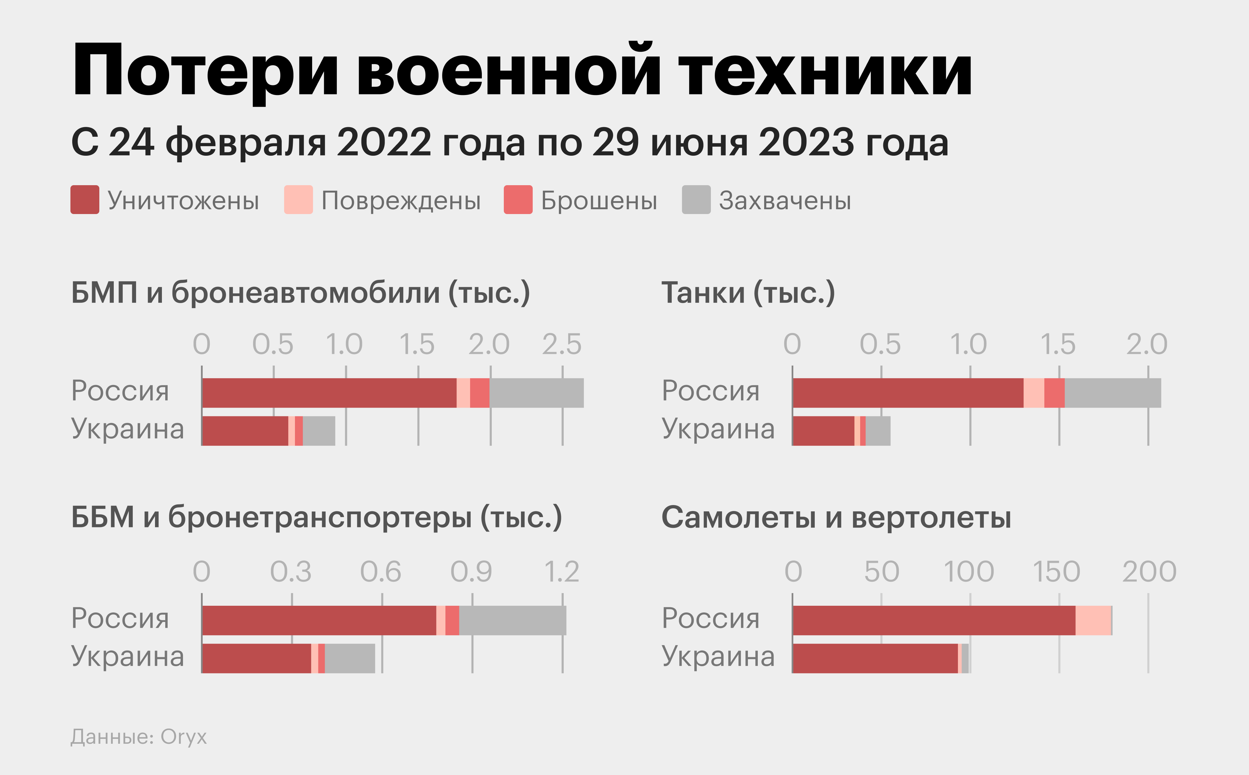 Полномасштабное российское вторжение стало очередным упражнением в устаревшей «войне на истощение», столкновение огромных объемов живой силы, стали и взрывчатых веществ. Западные эксперты и разведки оценивают потери России более чем в 200 тысяч человек убитыми и ранеными. Это почти в четыре раза больше, чем советские потери в Афганистане — в войне, которая длилась десятилетие. Это две с половиной британские армии. По данным американских источников, только за период с декабря 2022 года по апрель 2023-го погибли более 20 тысяч россиян, большинство из них в Бахмуте или его окрестностях. Со времен опустошительной осады Басры Ираном в 1987 году воюющая армия не несла потери живой силы настолько быстро за столь короткое время.