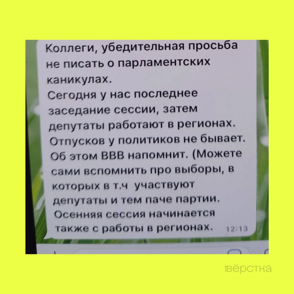 В сообщении отмечается, что «отпусков у политиков не бывает». «Об этом сам ВВВ напомнит», — говорится в нём (имеется ввиду спикер Госдумы Вячеслав Викторович Володин).