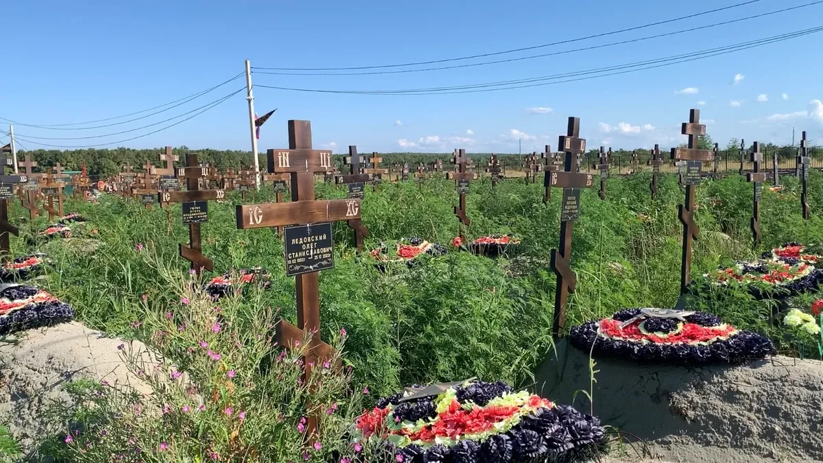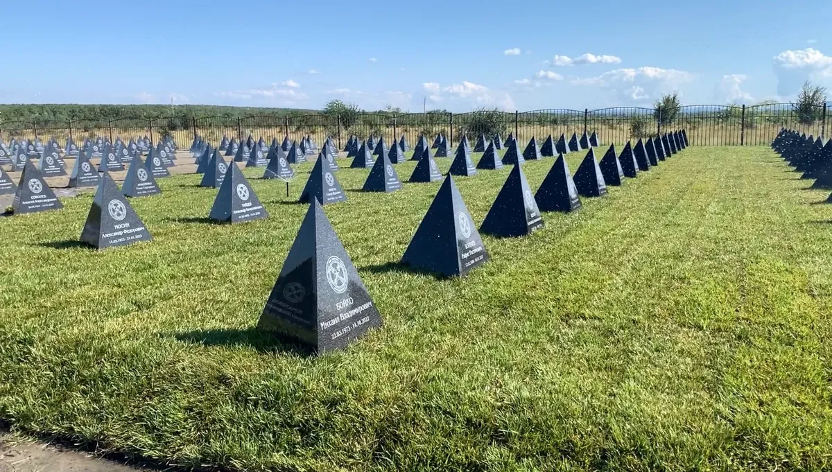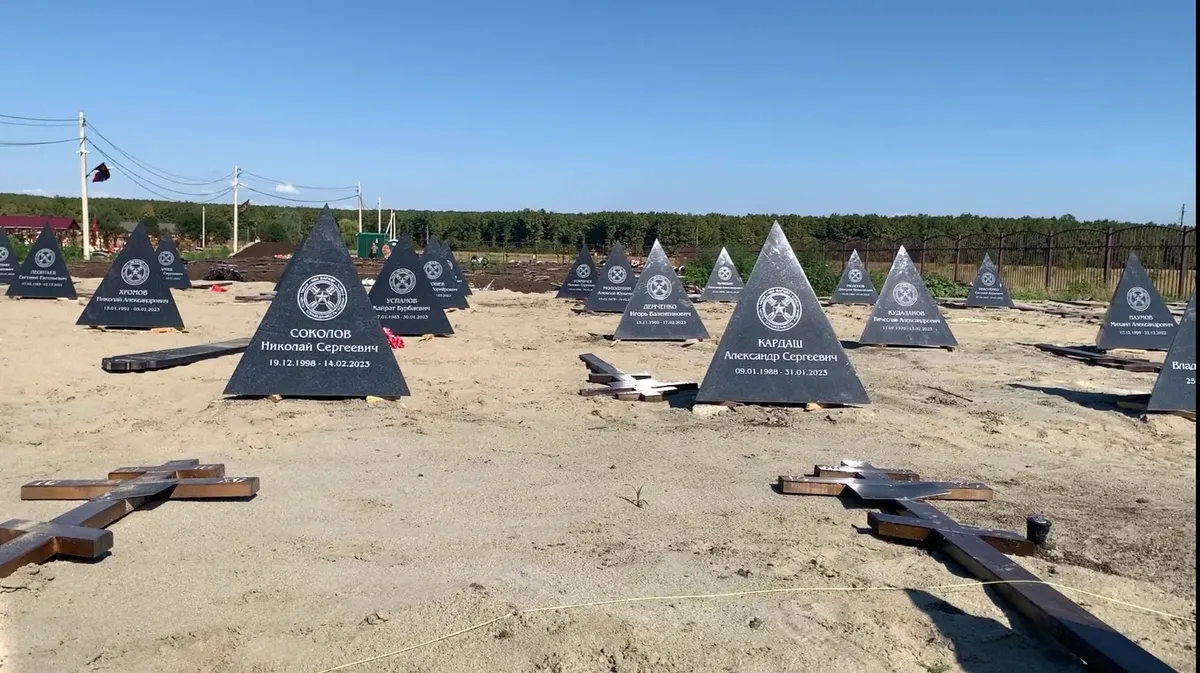 Невысокая черная ограда отделяет захоронения бойцов ЧВК от гражданских. Кладбище наемников разделено аллеей на две части. По левую руку — обычные, пусть и плотно стоящие друг к другу могилы с крестами. По правую (и в это сначала не верится) — пирамиды, похожие на «зубы дракона»: такие же, какие устанавливали на границе с Украиной, но серые, с эмблемами «Вагнера» и именами похороненных под ними. Впрочем, лежат ли под пирамидами люди, непонятно: «зубы дракона» устанавливают на ровной песчаной площадке, трое рабочих из Центральной Азии затаскивают их и устанавливают рядами.