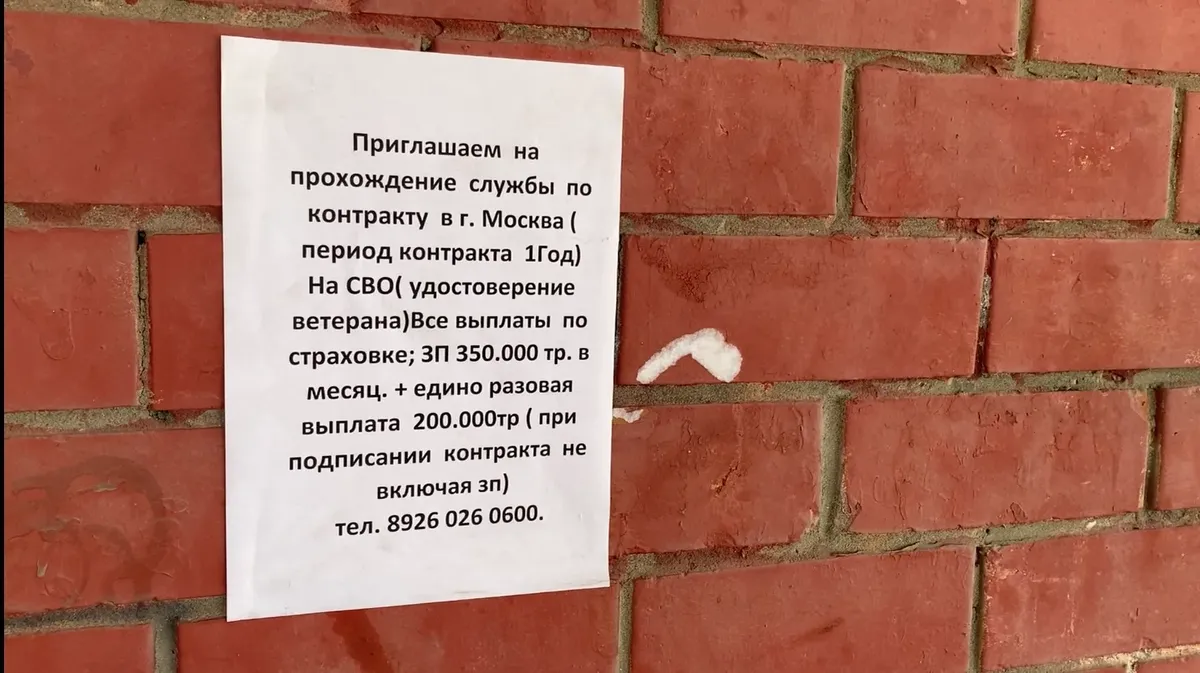 Он просит меня не задерживаться на КПП и идти обратно к мосту. Под мостом, пытаясь вслушиваться в разговоры военных (впрочем, не имеющие большой ценности), снимаю объявления: «Требуются разнорабочие. Зарплата от 1000 до 1500 + % в день. Комфортное бесплатное проживание»; «Приглашаем на прохождение службы по контракту. На СВО (удостоверение ветерана). Все выплаты по страховке. ЗП 350 000 в месяц + единоразовая выплата 200 000».