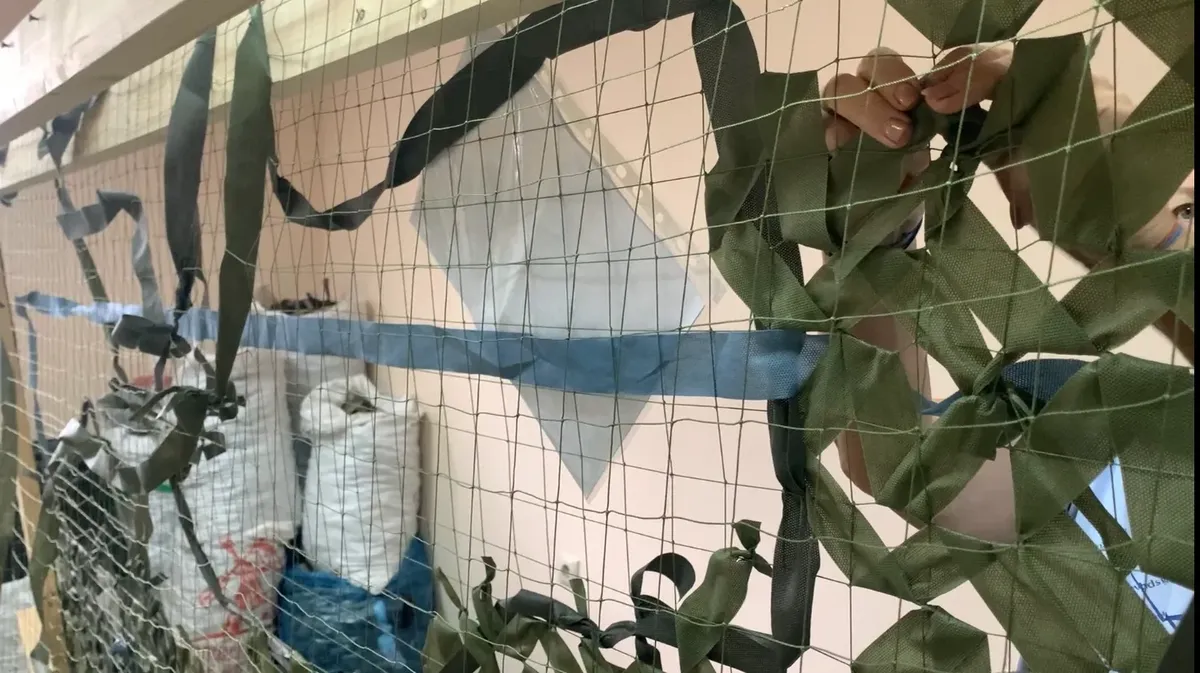 На стене рядом с российским флагом — образцы тканей и краткие инструкции: «Если нет светлого хаки на переход — использовать 2-й зелено-коричневый»; «Сеть «Окоп»: основа (50%) — цвет «песок», переход (20%) — цвет «темный хаки», пятно (30%) — «светлый хаки». Всего четыре типа сетей: помимо окопной, для города, леса и поля.