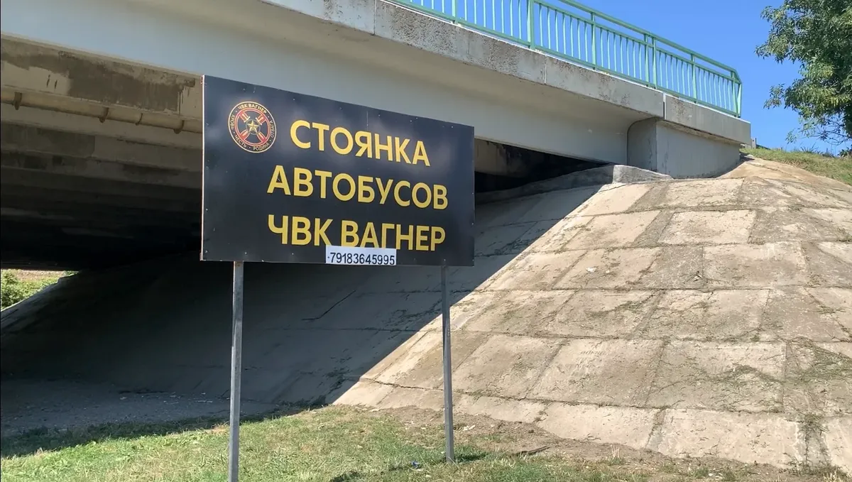 Вся «жизнь» действительно начинается под автомобильным мостом, где небольшими группами тусуются люди в одежде цвета хаки. У входа в арку — баннер: «Стоянка автобусов ЧВК «Вагнер»». Автобусов, впрочем, здесь нет. Иногда за ожидающими подъезжают обычные легковые автомобили, в которые они грузятся по три-четыре человека. Из-за моста со стороны воинской части то и дело выходят новые группы мужчин с сумками. Все здоровые боровы, хотя явно не все спортсмены — у многих над ремнем нависает солидное брюшко.