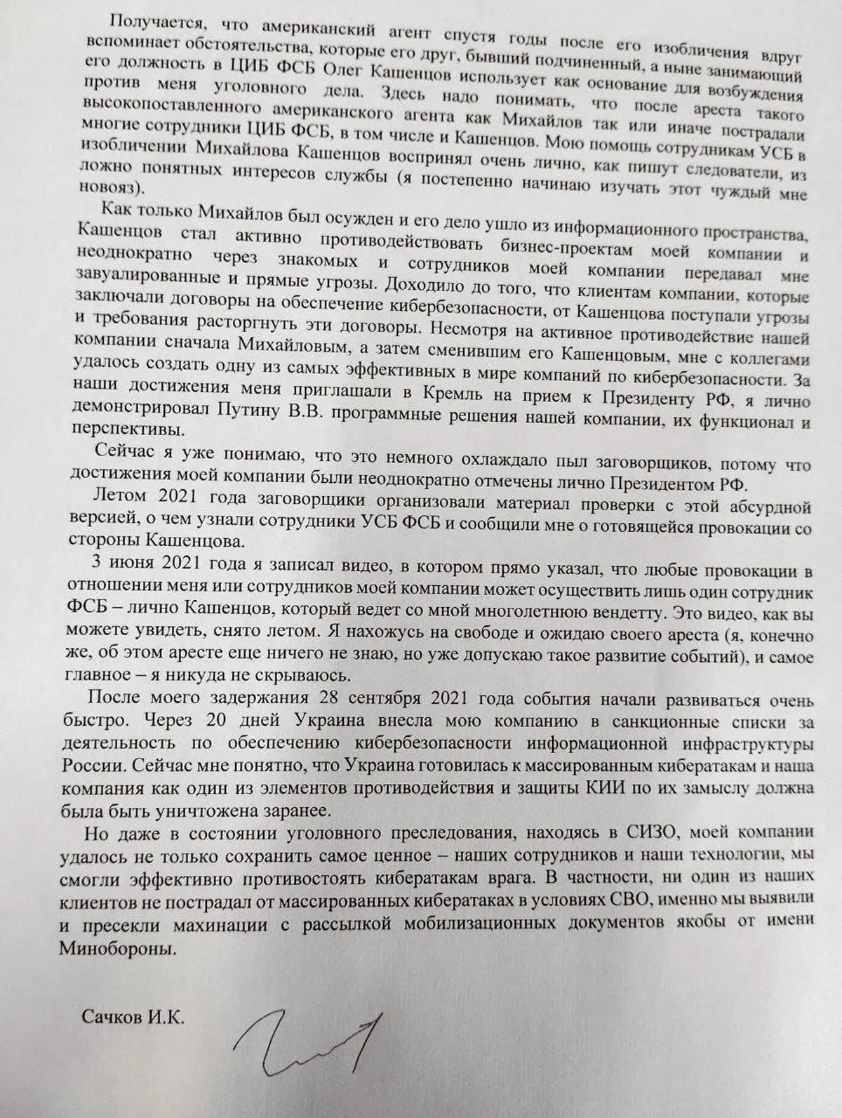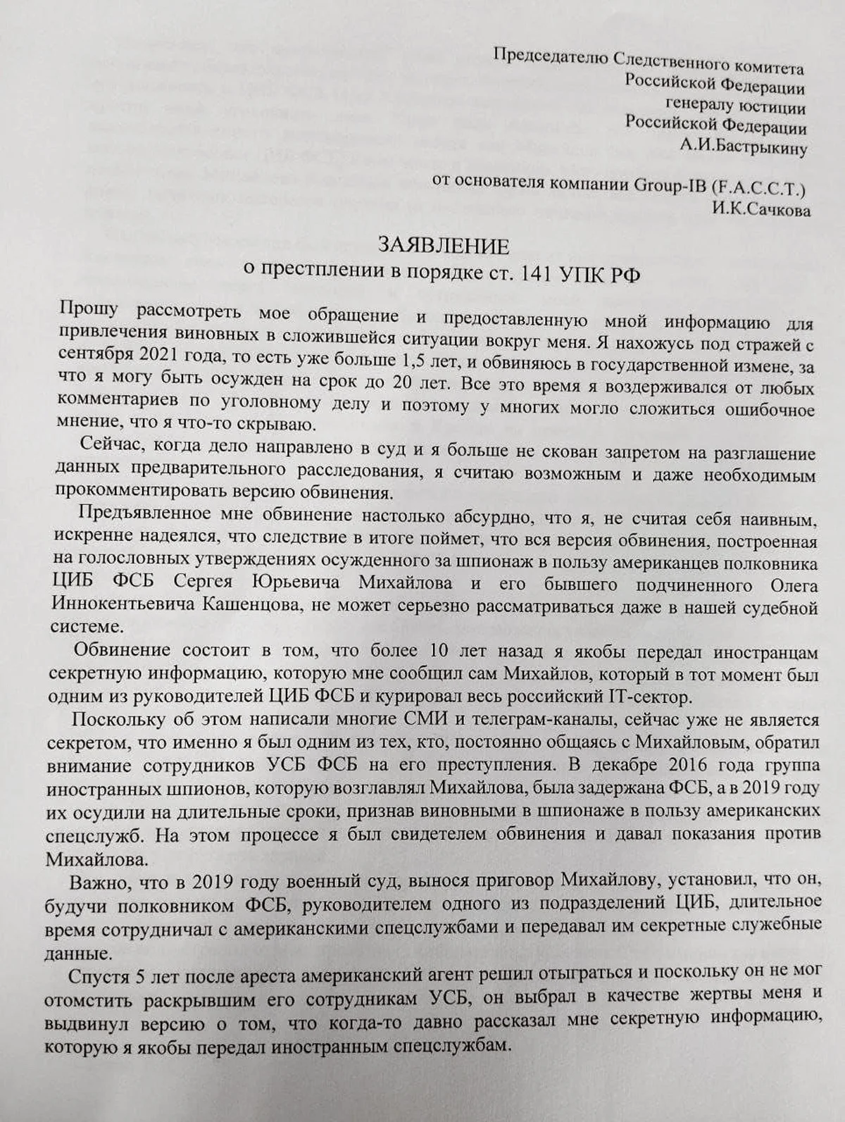 Сачков неслучайно упомянул спецслужбы США. За неделю до начала прений на процессе в Мосгорсуде бизнесмен обратился к руководителю Следственного комитета России Александру Бастрыкину с заявлением о преступлении (есть в распоряжении редакции). В этом документе Сачков изложил версию, согласно которой он оказался в Лефортово якобы по оговору бывшего начальника 2-го управления Центра информационной безопасности ФСБ экс-полковника Сергея Михайлова, в феврале 2019 года осужденного на 22 года колонии строгого режима по ст. 275 УК за государственную измену.