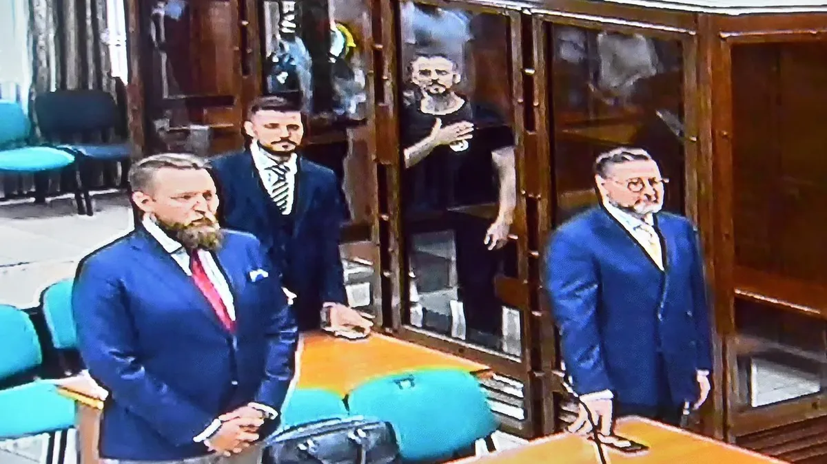 Вынесение приговора основателю и генеральному директору Group-IB Илье Сачкову. Илья Сачков (второй справа) на экране монитора во время трансляции заседания суда, 26 июля 2023 г. Фото: Ирина Бужор / Коммерсантъ
