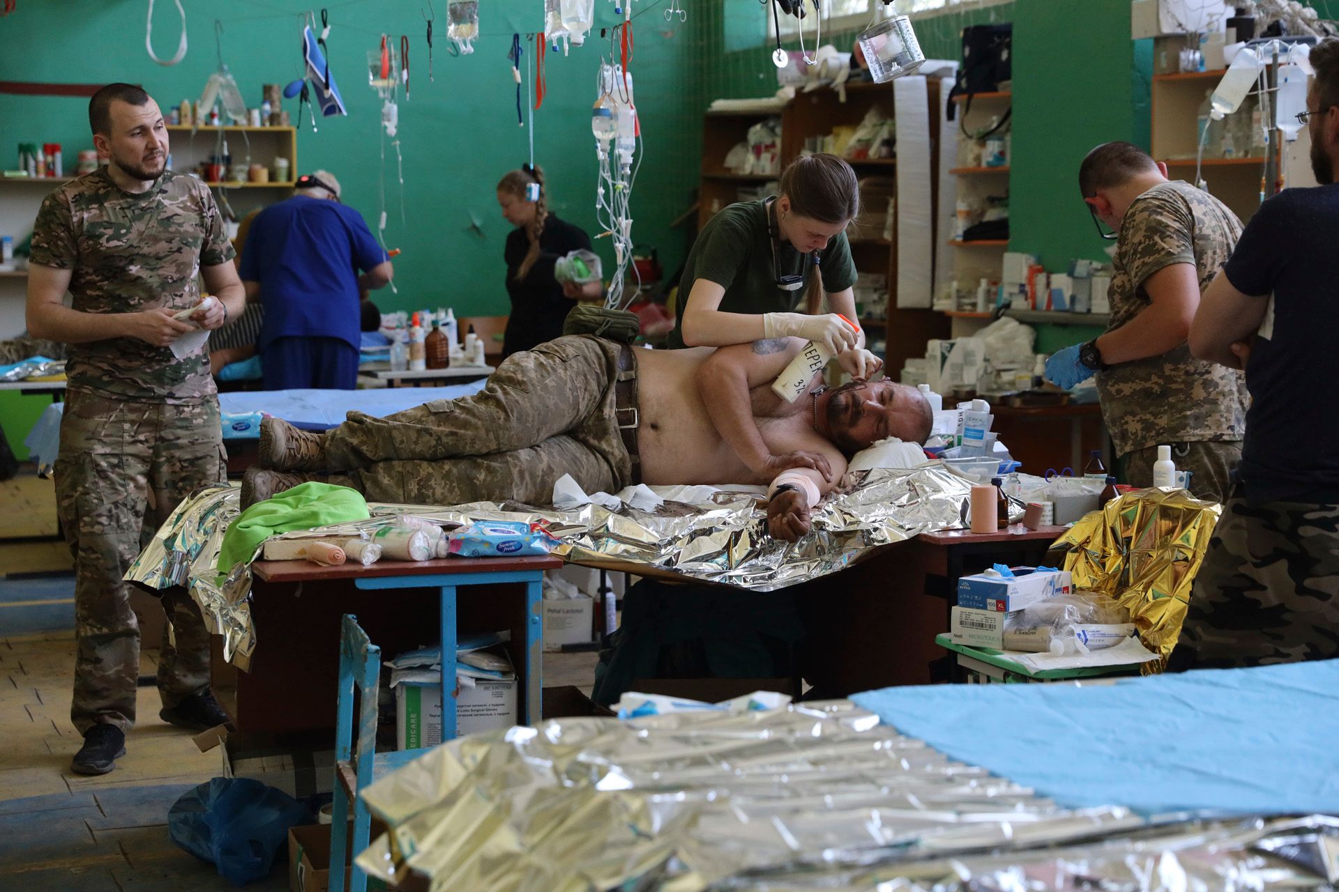 Kateryna Klochko / AP / Scanpix / LETA Врачи помогают раненому бойцу ВСУ в медпункте в Запорожской области
