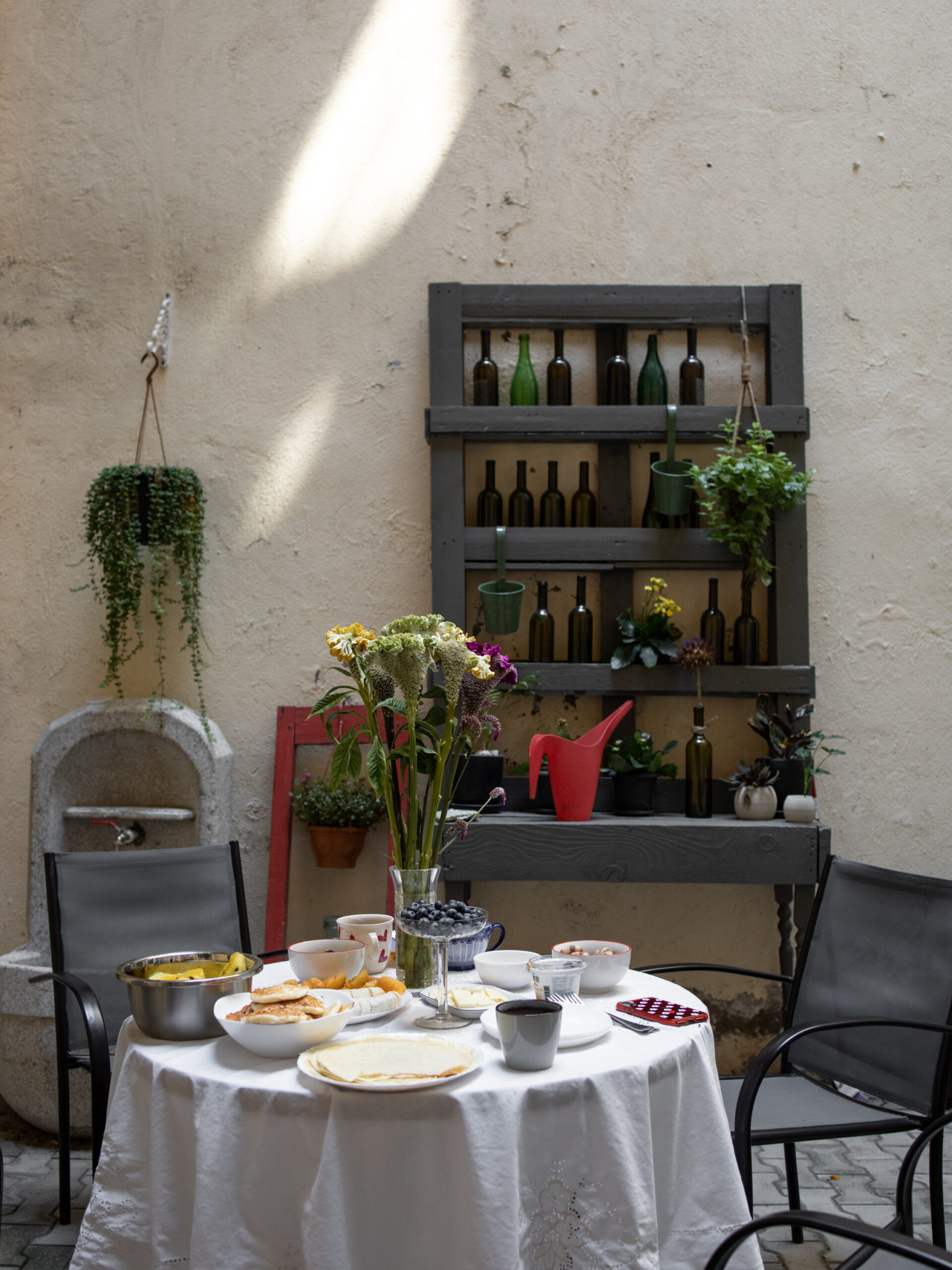 С первого дня мы начали собирать предметы, которые бы создавали уют; этот процесс продолжается до сих пор. На стол, который стоял во дворе, мы постелили скатерть. Плюс недавно друзья отмечали день рождения во дворе, и с него осталась стена из дождика и флажки.