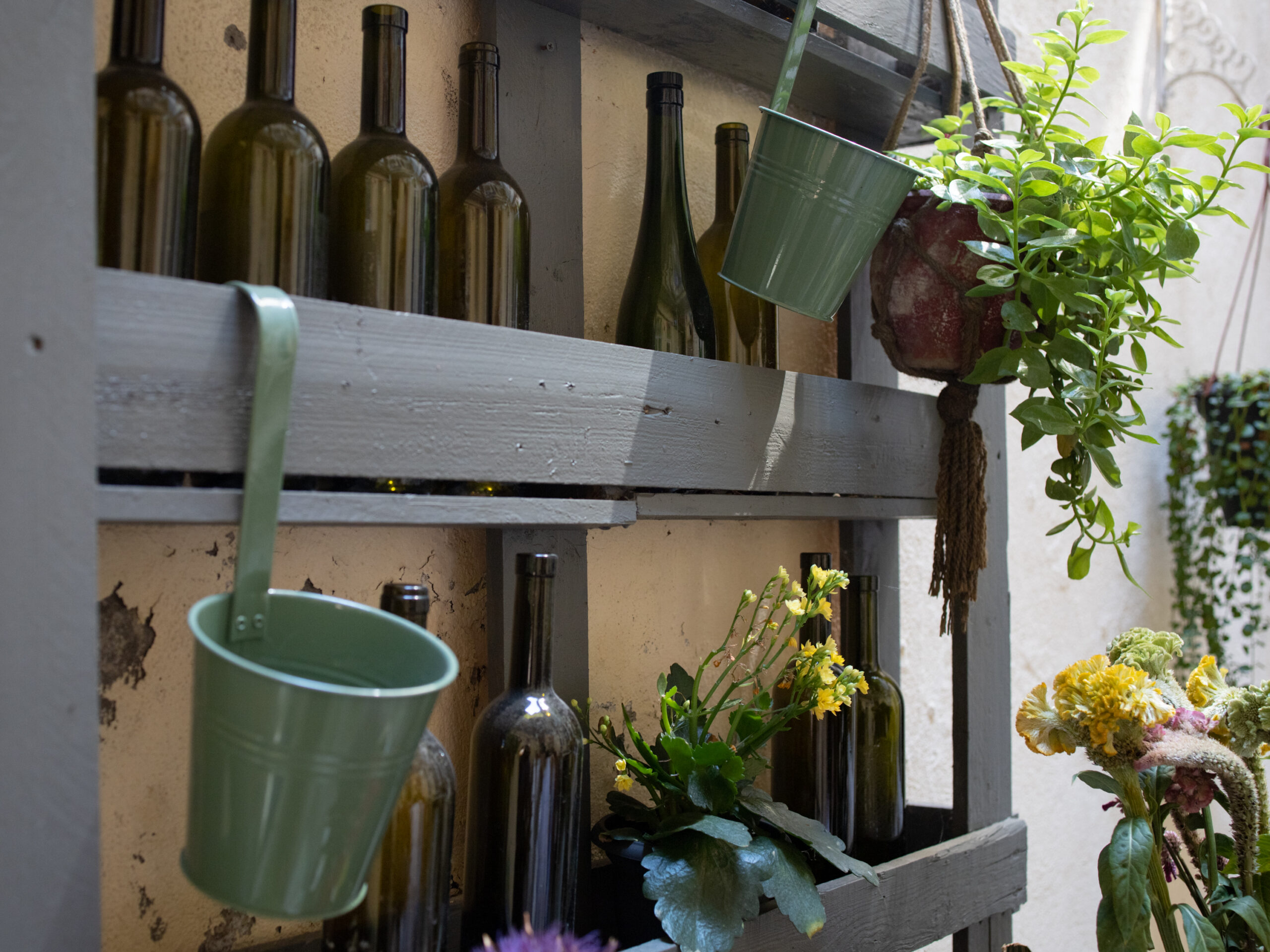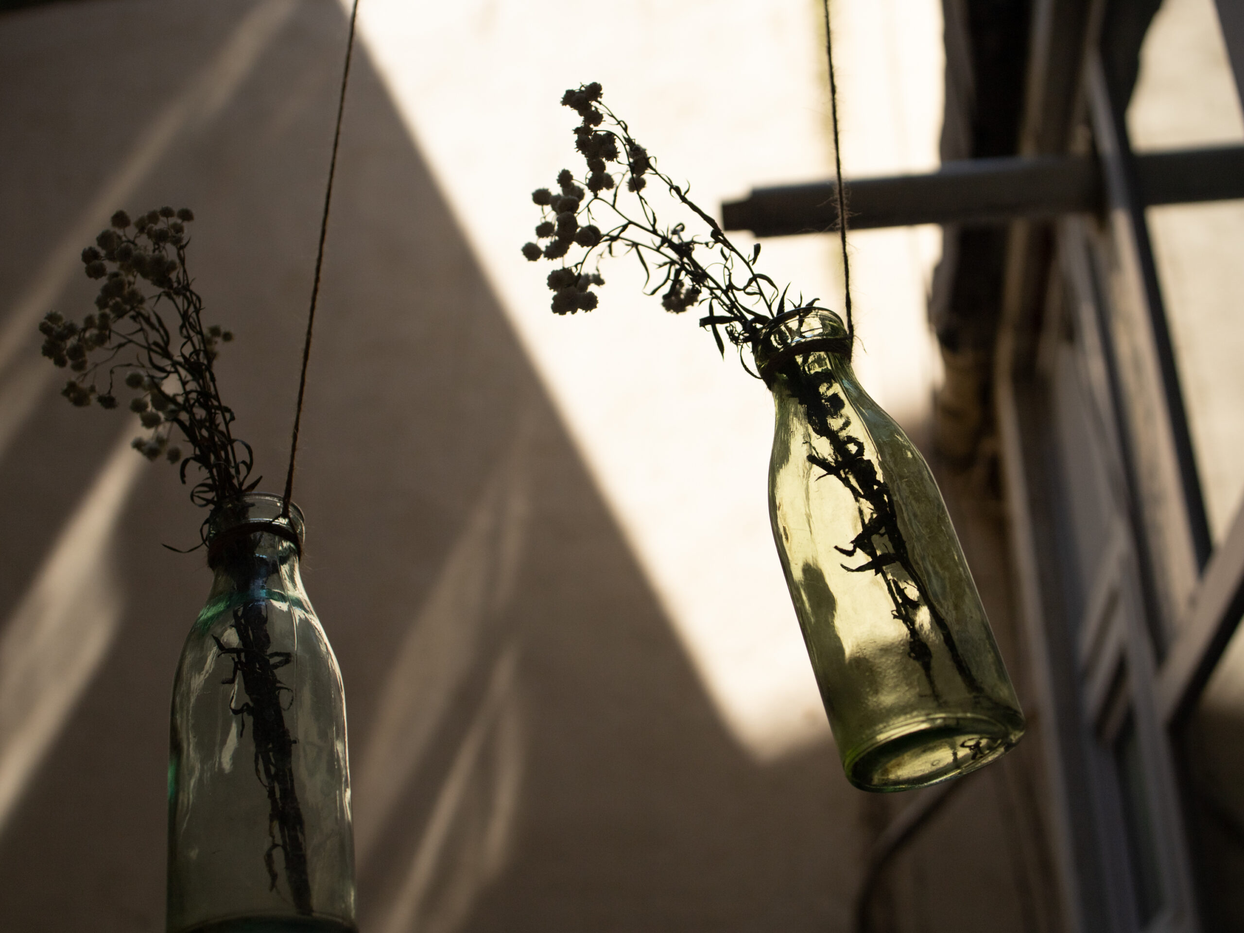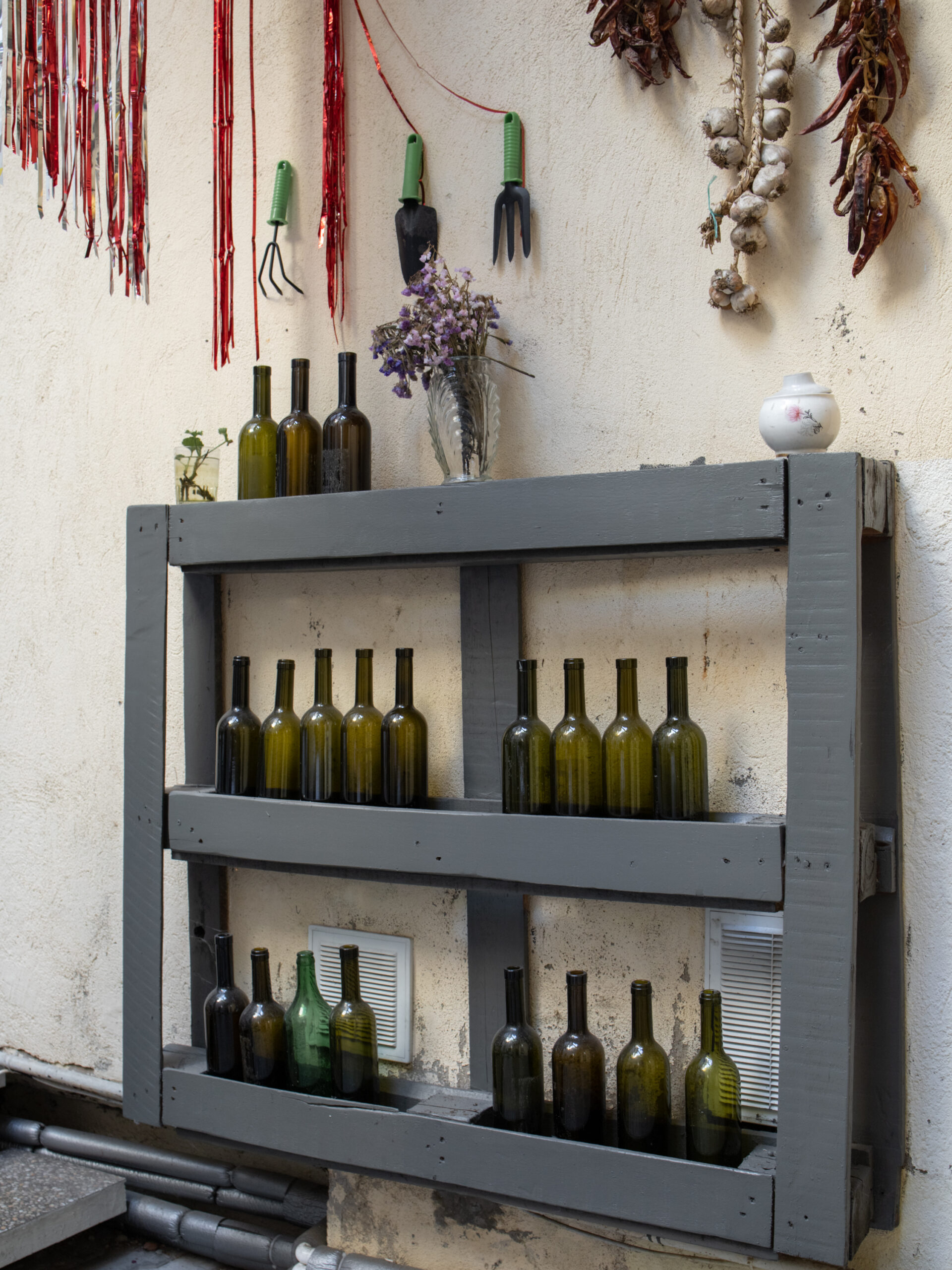 После уборки мы купили краску и покрасили всё, что могли. Мы повесили новые веревки для белья. Использовали как декор бутылки из-под вина, которых было много во дворе, — несколько из них закрепили на бечевке и ставим туда сухоцветы. Получается немножко свадебное настроение, но нам нравится.