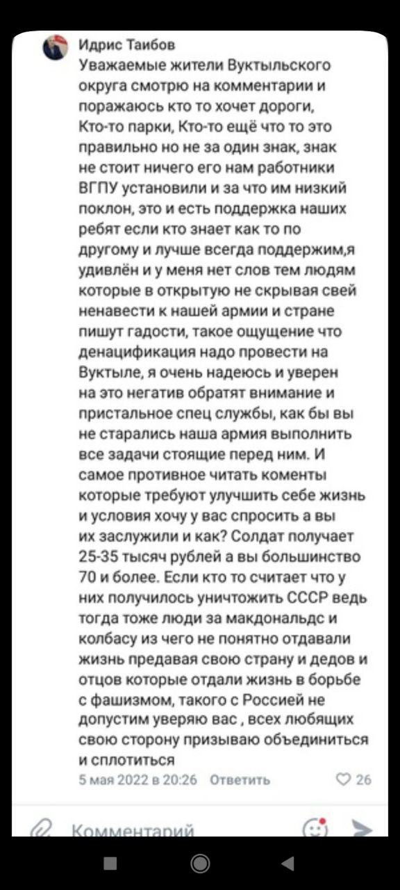 Пока Владимир угрожает Радмиле расправой, депутат Таибов призывает "спецслужбы" обратить внимание на антивоенные публикации горожан. В одном из своих комментариев Таибов написал, что "денацификацию", которой российские власти изначально объясняли военное вторжение в Украину, нужно провести и в Вуктыле.