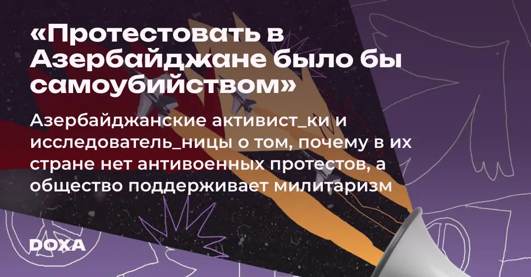 Азербайджан участвует в Карабахском конфликте вот уже больше тридцати лет. За это время произошли две кровопролитные войны и бесчисленное количество перестрелок на границах, а прямо сейчас люди, которые называют себя «экоактивистами» из Азербайджана, блокируют непризнанную Нагорно-Карабахскую Республику. Мировое сообщество осуждает блокаду так же, как в предыдущие годы осуждало боестолкновения между сторонами. При этом в самом Азербайджане людей, выступающих против эскалации, почти не слышно, а антивоенных протестов и вовсе нет. DOXA решила разобраться, почему так происходит, и пообщалась с исследователь_ницами и антивоенными актист_ками из Азербайджана о репрессиях, пропаганде ненависти и попытках говорить о мире.