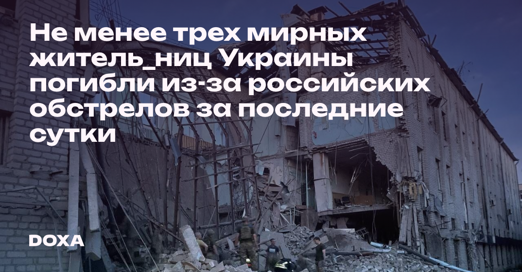 Не менее трех мирных житель_ниц Украины погибли из-за российских обстрелов за последние сутки, еще как минимум 20 человек получили ранения, сообщают местные администрации. Обстрелам подверглись Донецкая, Херсонская, Харьковская, Запорожская, Николаевская, Днепропетровская и Сумская области.