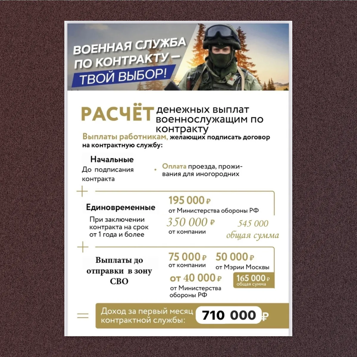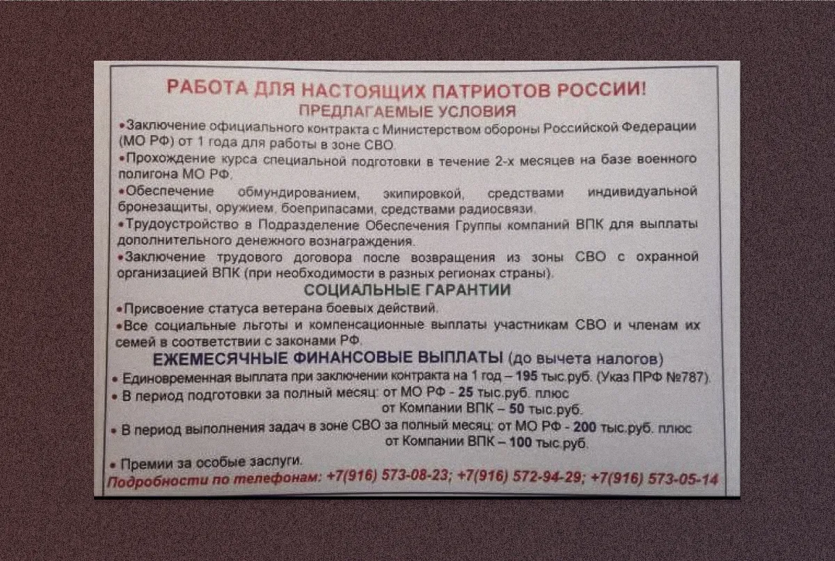 «Крупнейшая федеральная компания в рамках поддержки военной службы по контракту приглашает добровольцев» — такое объявление на Avito дала компания с труднопроизносимым, но сугубо мирным названием «Инжтеплопрогресс». Условия примерно как везде: 400 тыс. рублей подъемные, потом — по 100 тыс. в месяц от компании и по 200 тыс. от Минобороны.