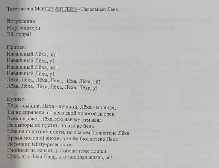 Кроме того, ранее политик рассказал, что к материалам его дела приобщили текст песни Моргенштерна «Навальный Леха».