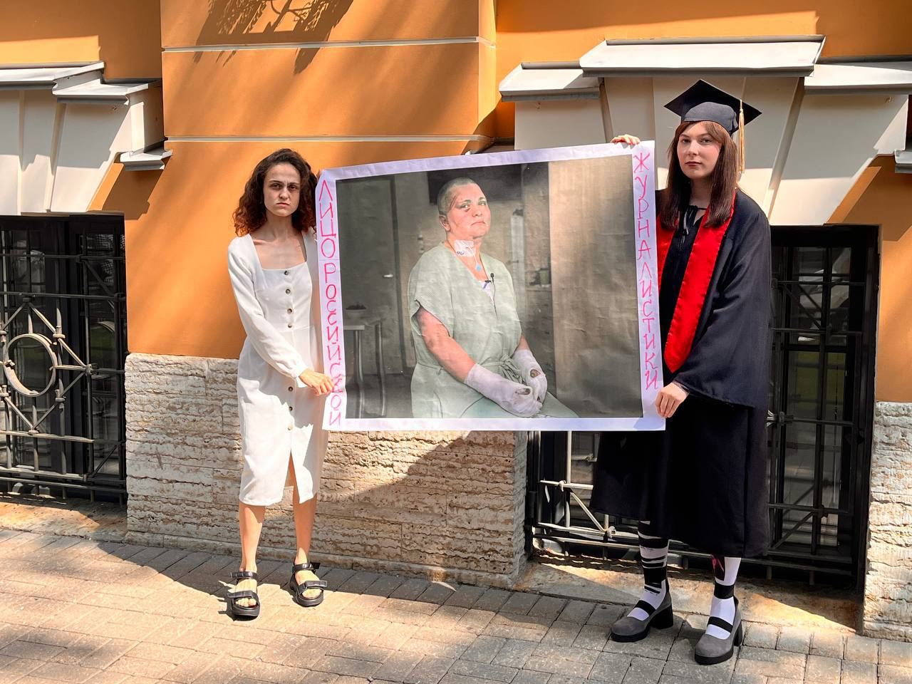 Выпускницы вышли с плакатом с надписью «Лицо российской журналистики» и фотографией Милашиной, которую незадолго до этого избили в Чечне.