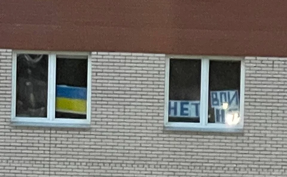 Изнутри повесили украинский флаг и баннер «Нет войне» жители одной из квартир в Красноярске. В итоге их окно коммунальная служба закрашивала белой краской — с помощью автовышки. Четвертый этаж.