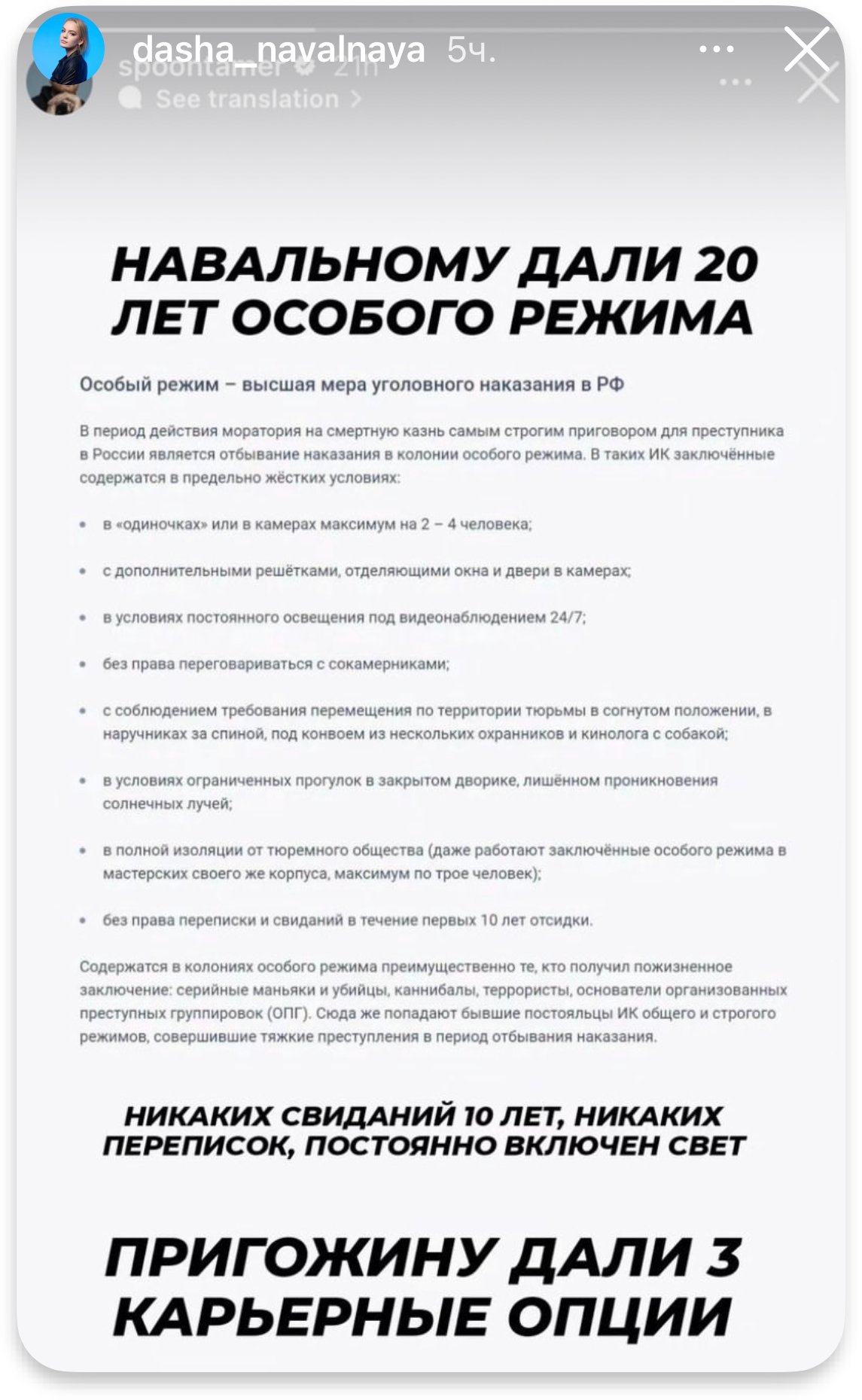 «Никаких свиданий 10 лет, никаких переписок, постоянно включен свет» — такую сторис стендап-комика Данилы Поперечного со скриншотом с сайта-«навигатора по колониям и СИЗО России» sizo.ru перепостила дочь Алексея Навального Дарья вскоре после оглашения приговора.