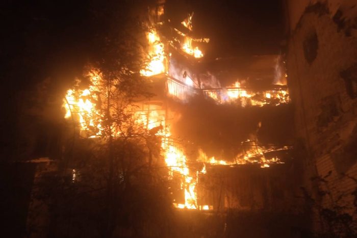 - После первой атаки в 00:50 в девятиэтажном доме возник пожар в девятиэтажном доме в центре города возник пожар. Двое прибывших спасателя пострадались во время тушения пожаров, их госпитализировали с тепловыми ударами.