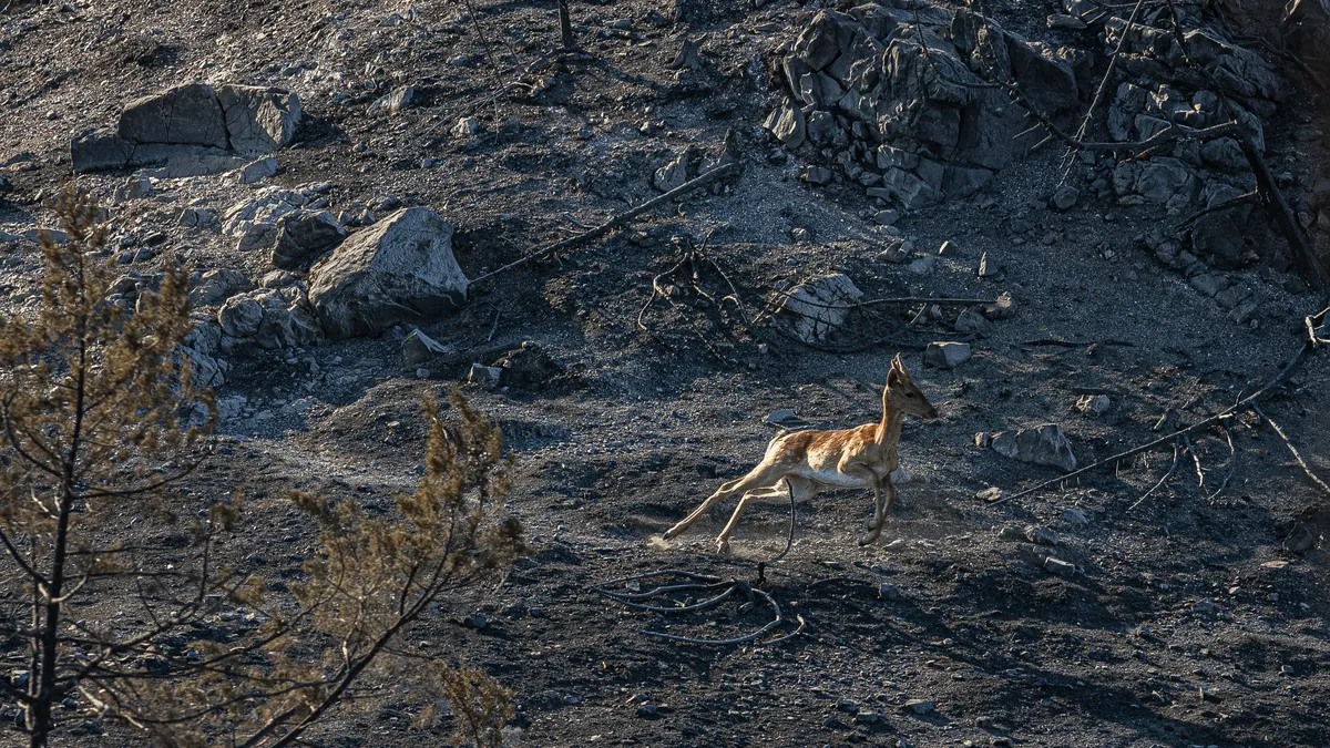 Олененок бежит в уничтоженном пожаром лесу возле деревни. Фото: Василий Крестьянинов / специально для «Новой газеты Европа»