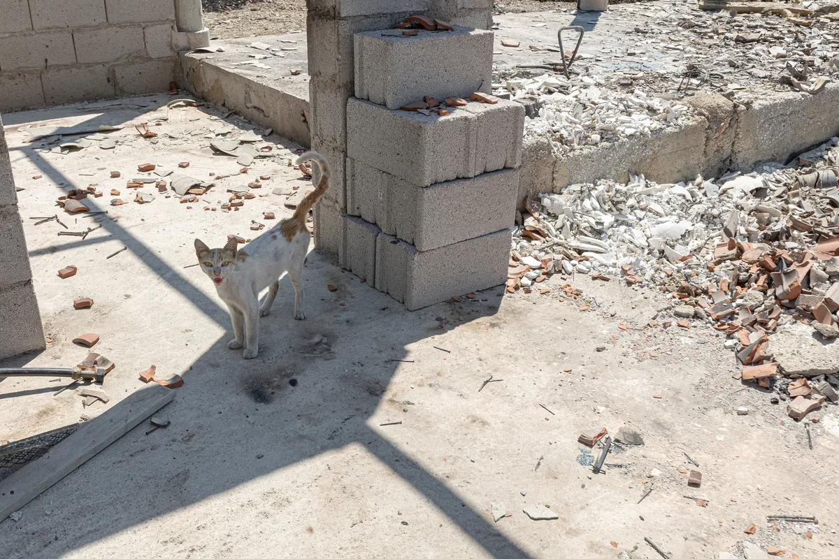 Огонь начался оттуда [показывает вдаль, за левую сторону дома]. Я не понимаю, как огонь пришел к моему дому, потому что здесь не было деревьев. Здесь была только трава. А у меня тут [перед домом] росло около десяти оливковых деревьев молодых. И они пропали, и фиговые деревья тоже пропали. У меня есть кошка, у нее шесть маленьких котят. Я думаю, что четверо из них сгорели. И они [пожарные] спасли только одного и мать. <…> Кошке было очень жарко, я дал ей воды, и она пила, пила, пила. Я пытался найти ее [когда начался пожар], но не смог. Она была под домом, и нам пришлось уйти. Два дня после пожара я ее не видел.