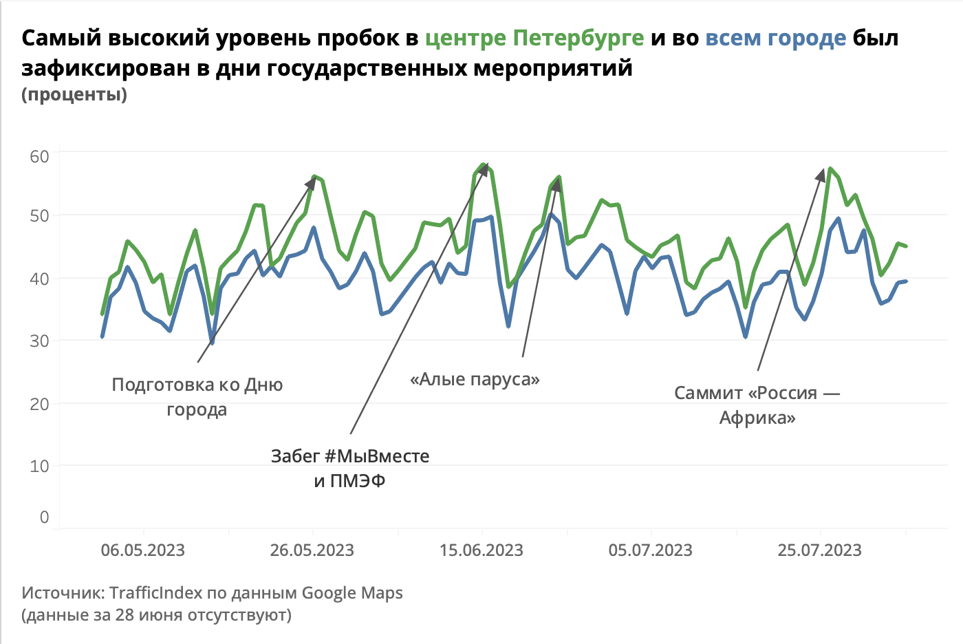 - 16 и 17 июня — ПМЭФ. По данным Traffic Index, уровень загруженности дорог составил 48,5 % и 38,5%.