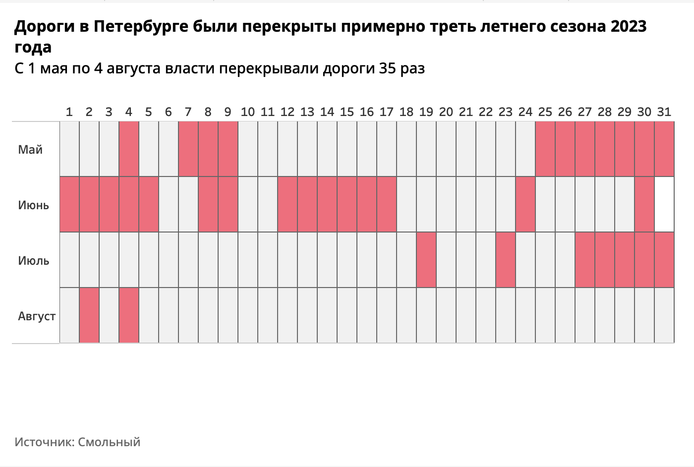 В общей сложности с 1 мая по 4 августа дорожное движение было ограничено 35 дней. Это более 36 % от всего периода, посчитала «Бумага» по официальным объявлениям Смольного.