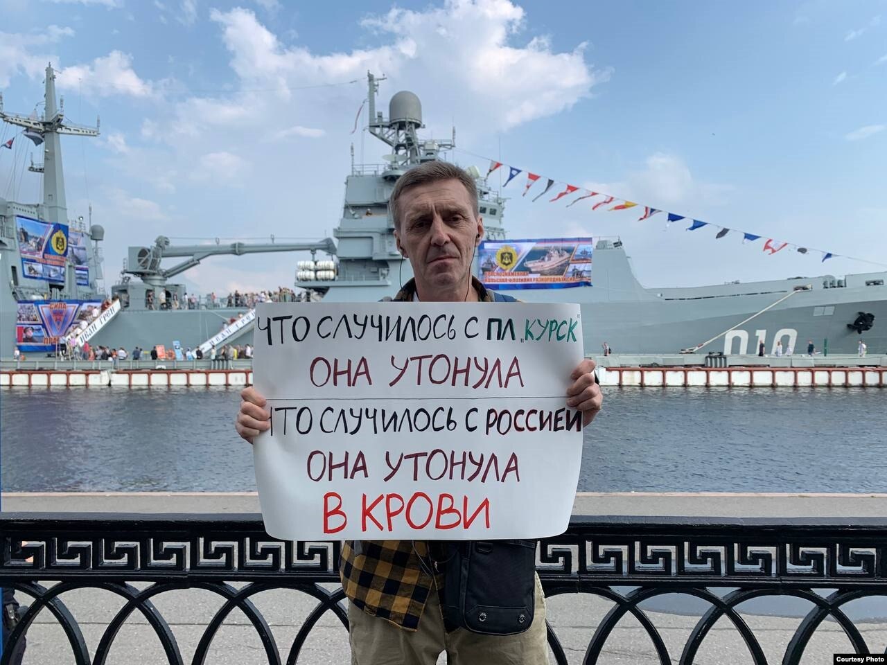 "Вчера была годовщина – 23 года как утонула подлодка "Курск". На корабле открылась выставка, в этом принимали участие официальные лица и адмиралы. Но на Серафимовском кладбище [место, где находится мемориал погибшим на "Курске"] были только вдовы и отставные моряки. Как так может быть?. Те люди, которые сейчас пошли из ложного патриотизма или за деньги на эту специальную военную операцию, думают, что родина с ними по-другому поступит? Не так как с Курском? Но увы – дальше будет именно так, как было с моряками на Курске", - сказал Иоффе Север.Реалии во время пикета.