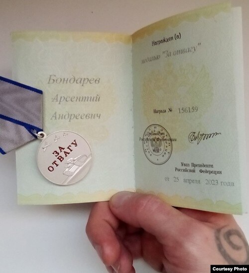 The Barents Observer нашел страницы Константина Приходченко и Арсентия Бондарева во "ВКонтакте". Страница первого закрыта для посторонних, но страница Бондарева открыта. На снимке, датированном 16 июля, – медаль "За отвагу". Она присуждена указом президента России от 25 апреля 2023 года. В банке документов на сайте Кремля этого указа нет, как, впрочем, и других сотен и тысяч указов – например о помиловании завербованных на войну заключенных.