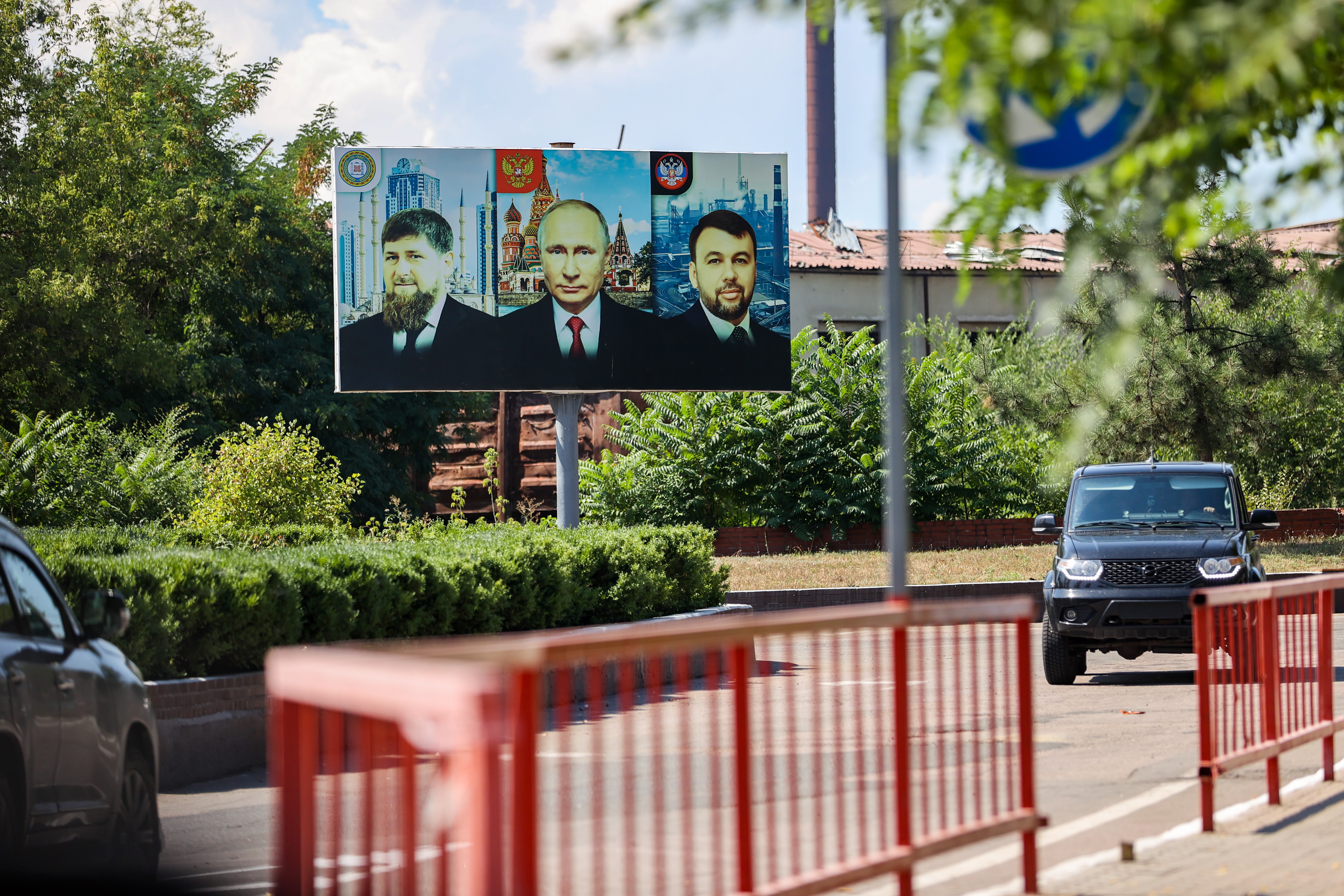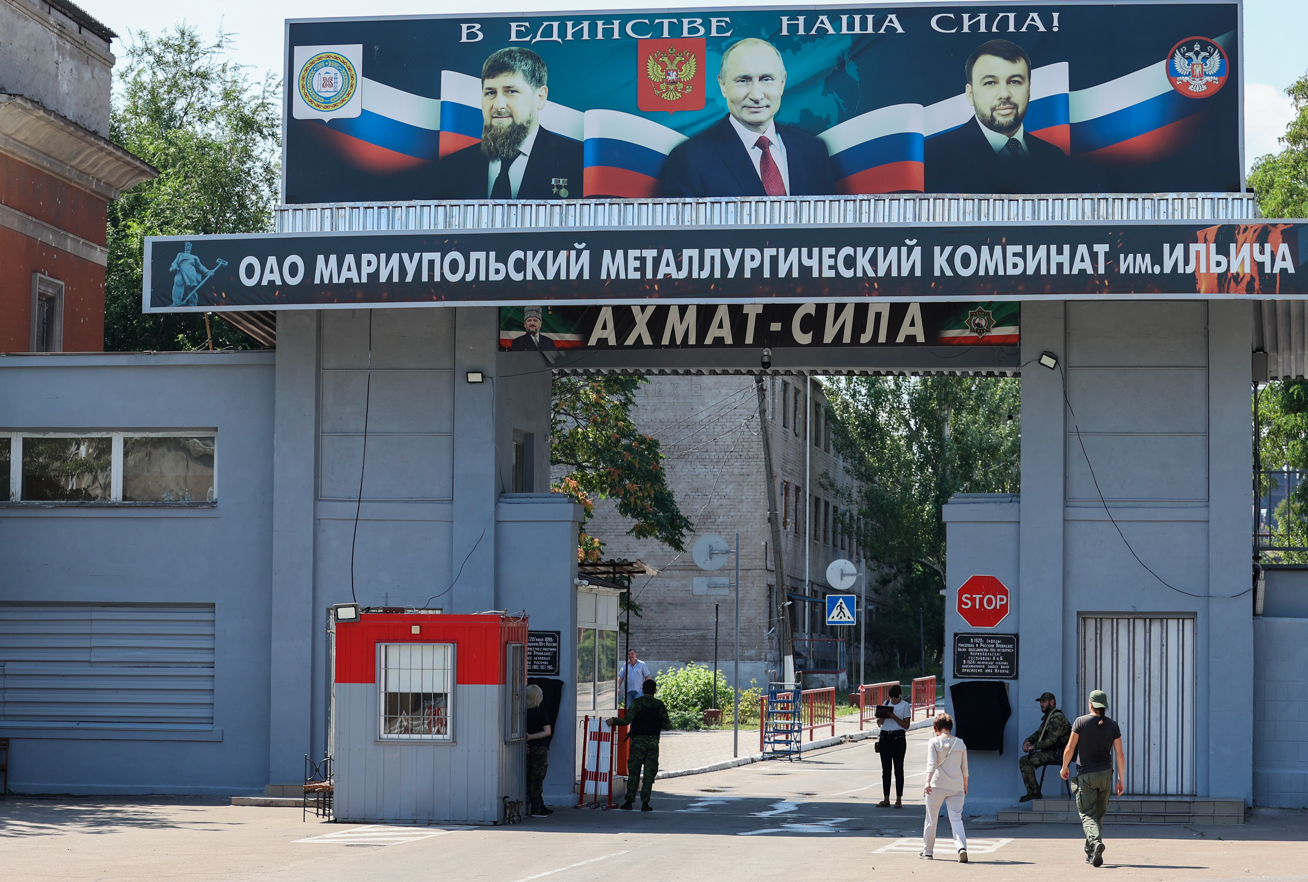 На проходной комбината появились таблички с портретами президента Владимира Путина, главы сепаратистской "ЛНР" Дениса Пушилина, а также самого Кадырова, под ними – пропагандистский слоган "Ахмат – сила!", отсылающий к культу отца главы Чечни.