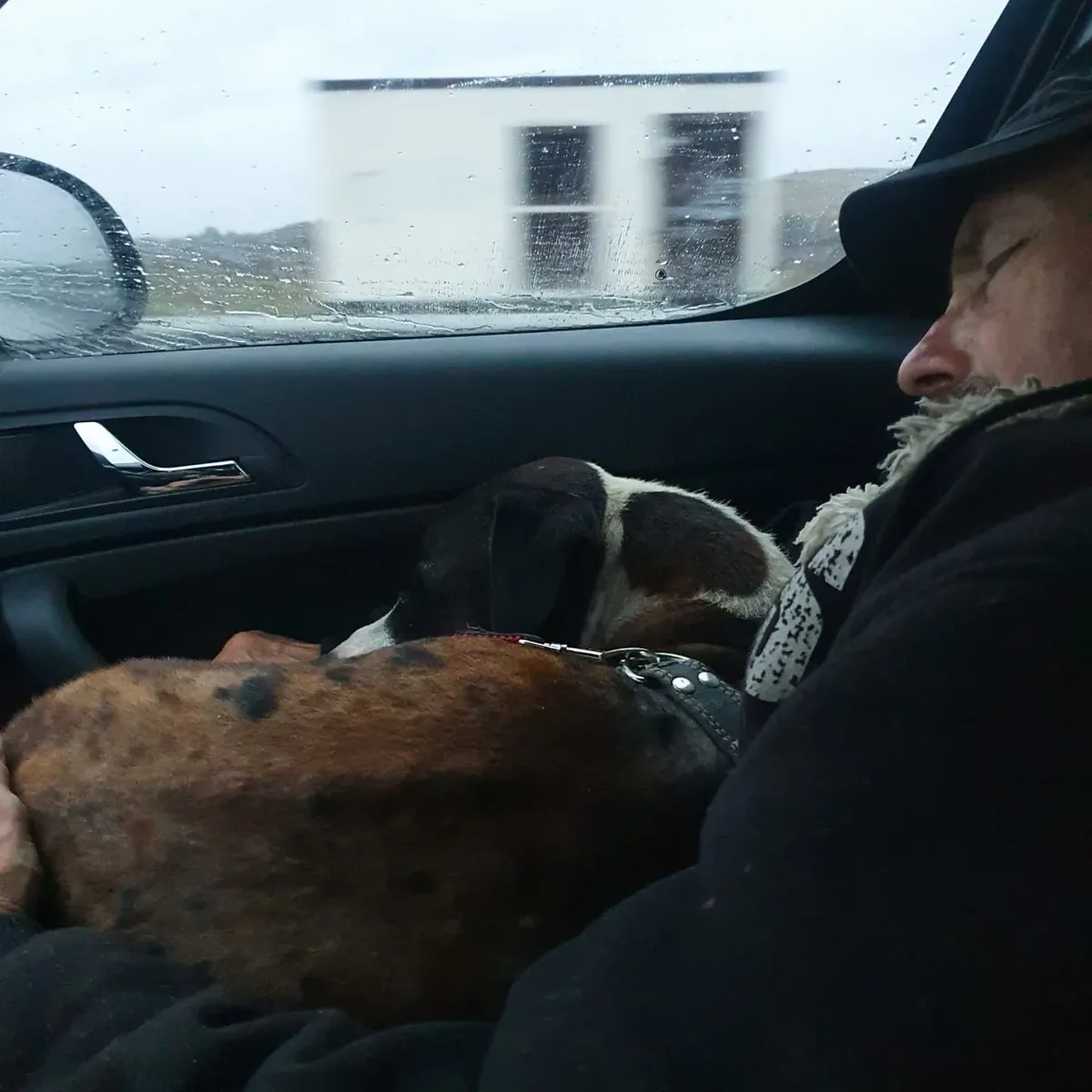Дедушка ехал на переднем сиденье и всю дорогу держал питбуля на руках. Было неудобно и тесно, но они даже спали в обнимку.